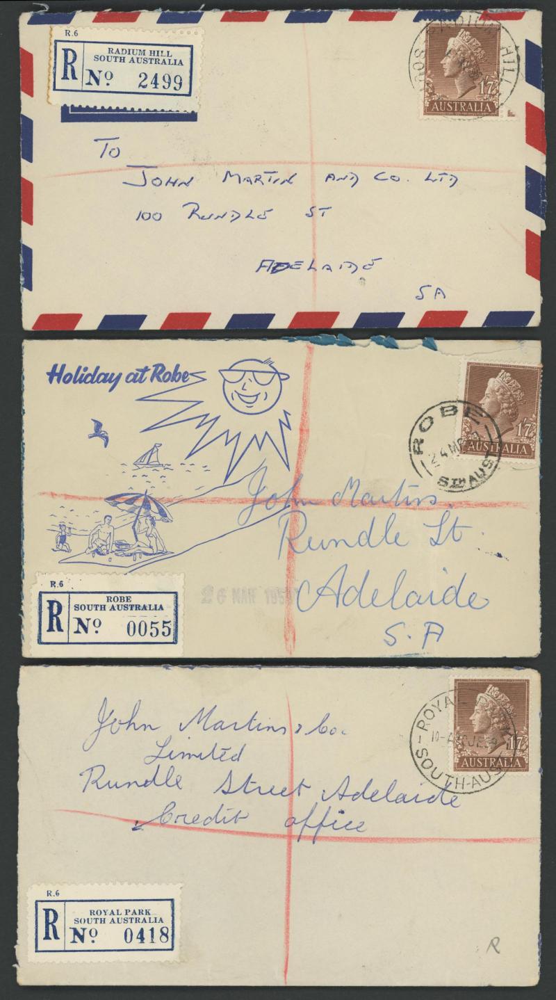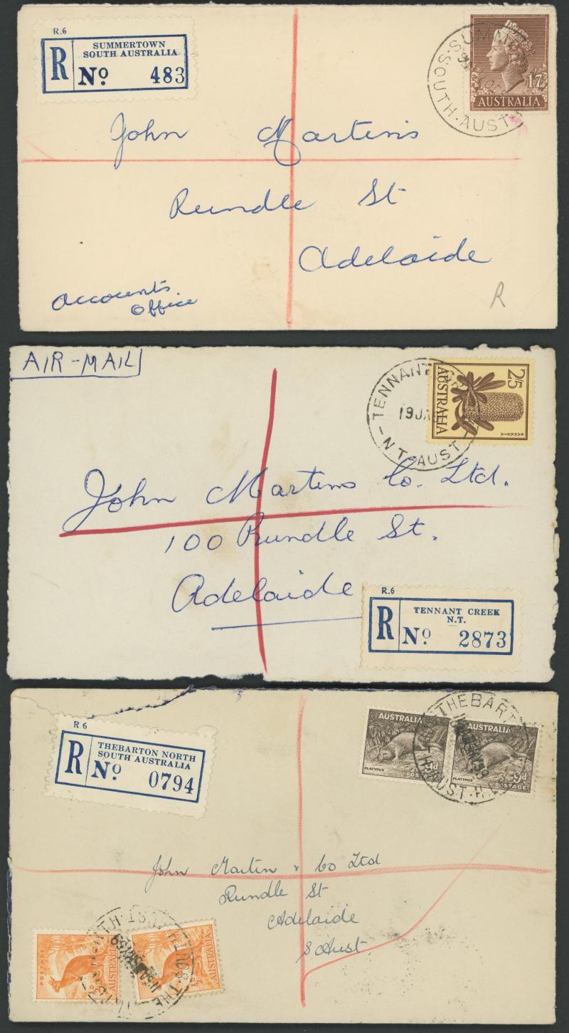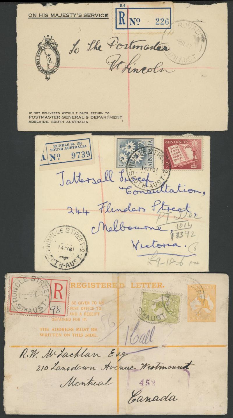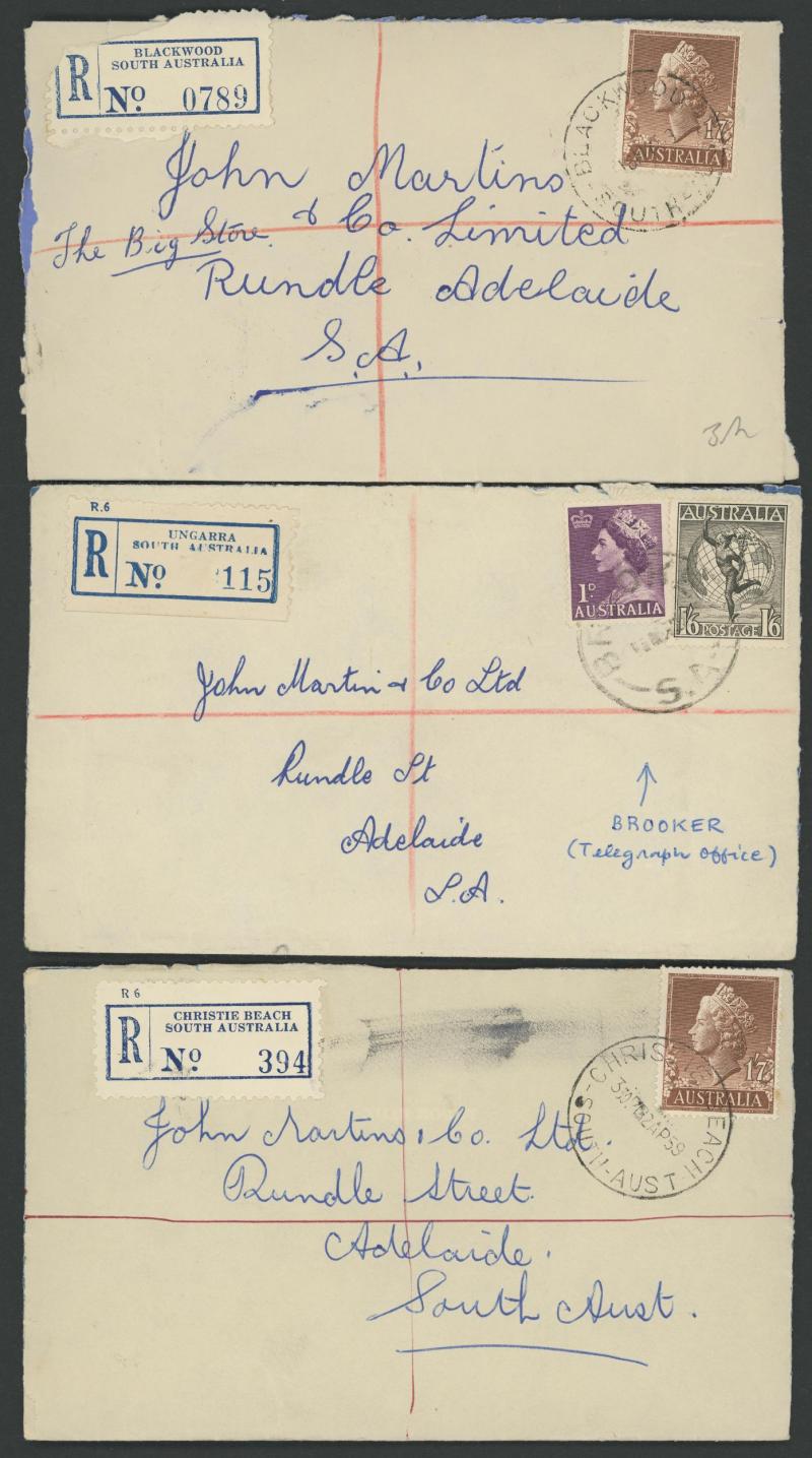 (SDL; the only recorded date), 'WHYALLA GEORGE AVENUE', 1937 'WAARACHIE', 1965 'WARRADALE/ 2 ', 1940 'WOKURNA', etc, many early provisional & makeshift R labels, mostly to large mail order companies with a high percentage opened-out. An exceptional