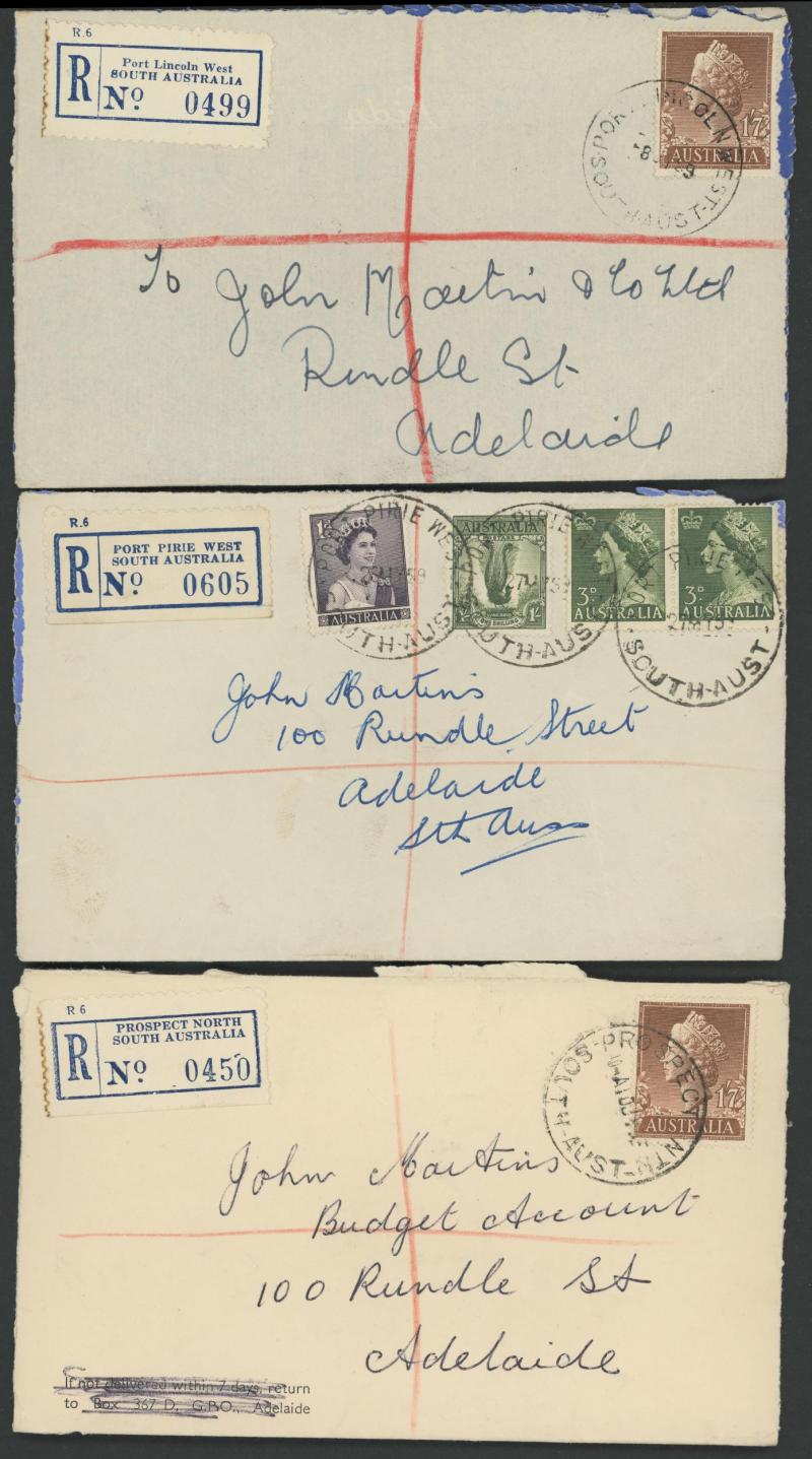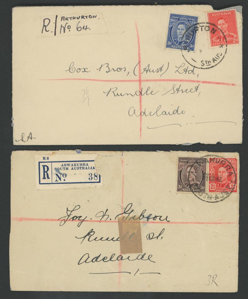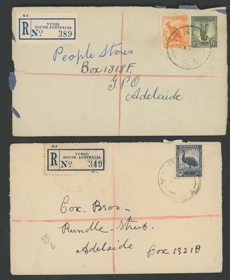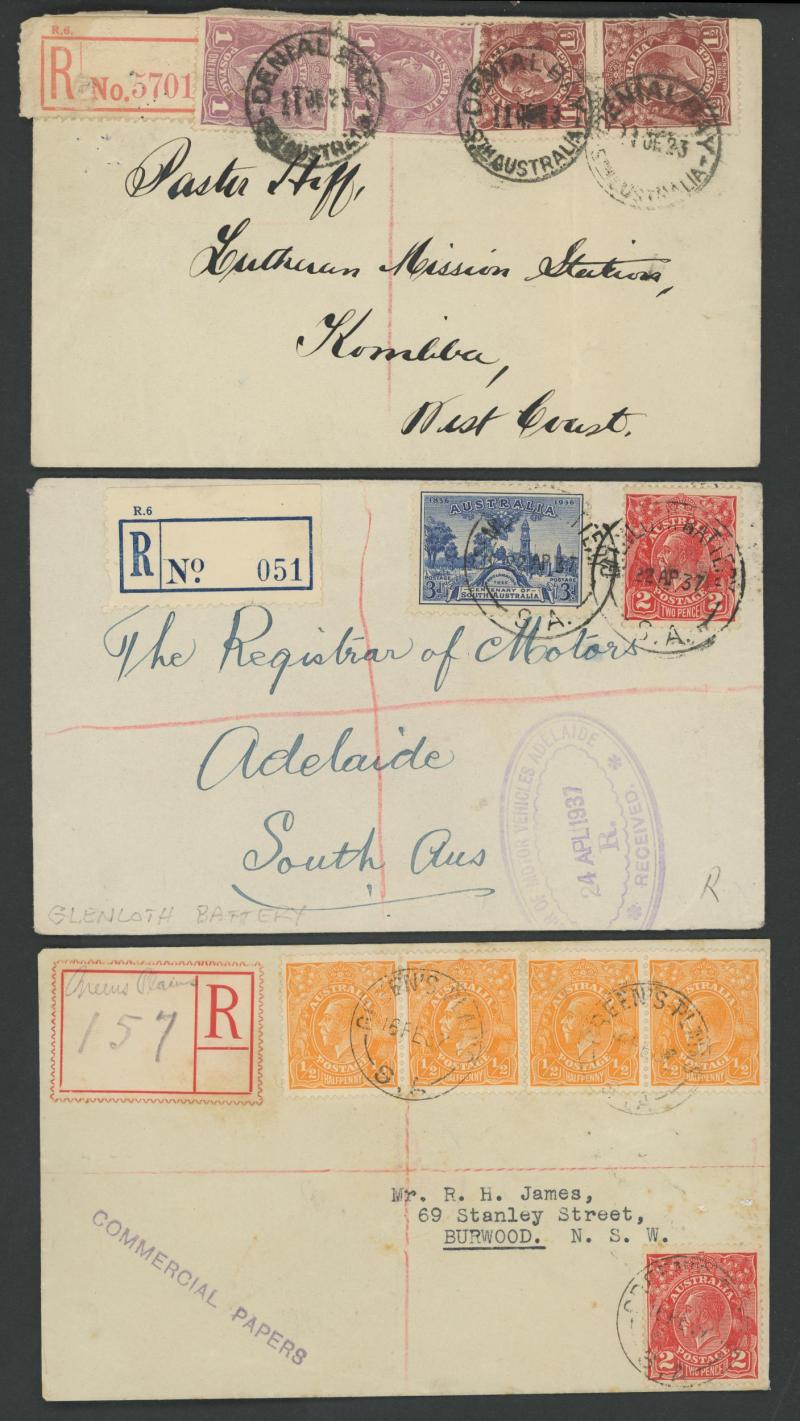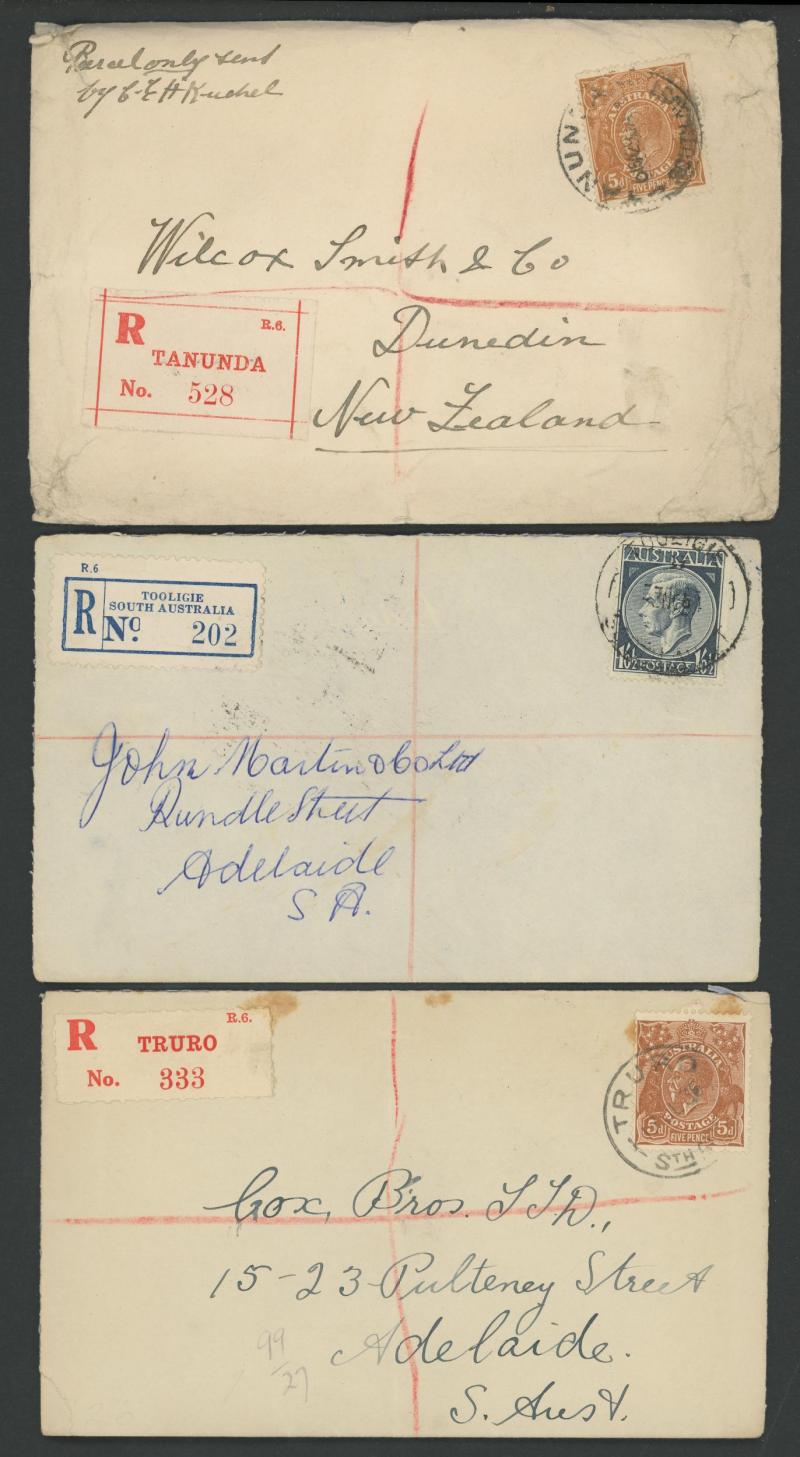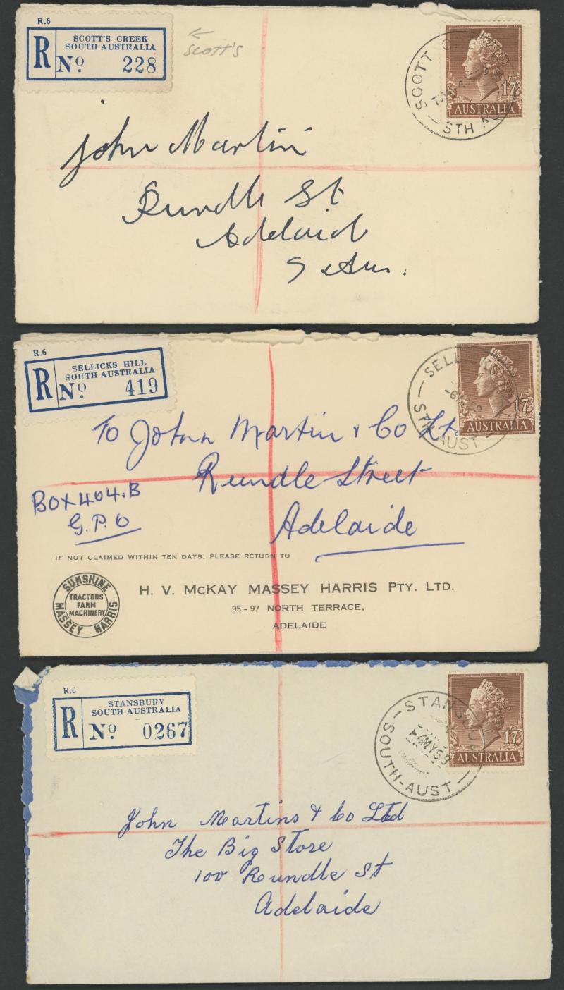 (SDL; the only recorded date), 'WHYALLA GEORGE AVENUE', 1937 'WAARACHIE', 1965 'WARRADALE/ 2 ', 1940 'WOKURNA', etc, many early provisional & makeshift R labels, mostly to large mail order companies with a high percentage opened-out. An exceptional
