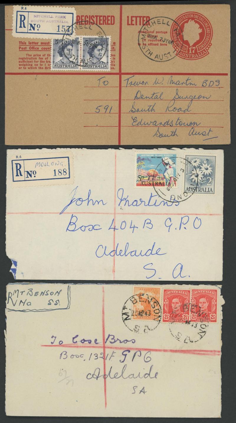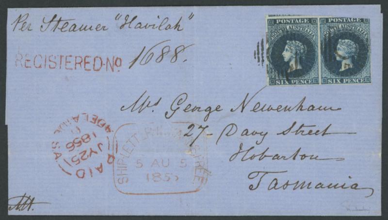 Early registered mail from South Australia is rare. Don Pearce had only four pre-stamp items, and none with First Issue frankings. His earliest stamped registered item was of 1859 (Sale 254 Lot 2510). (Image1) (Image2)