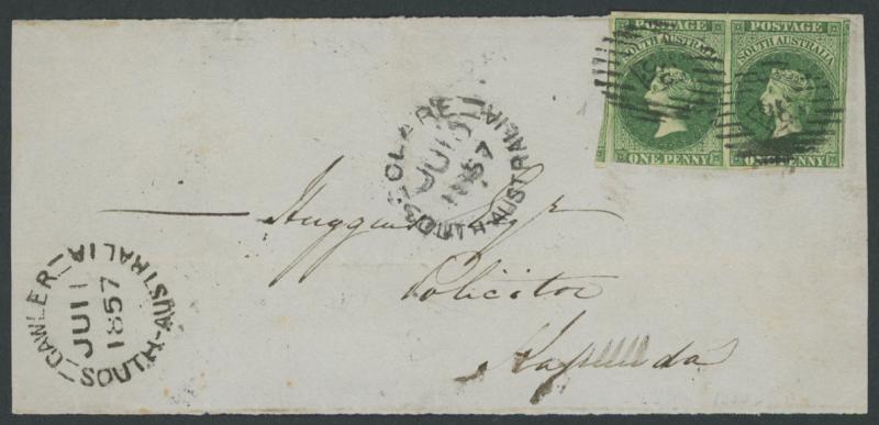 1857 (June 10) address-portion of an entire letter to "Huggins Esq/Solicitor/Kapunda" franked with London Printings 1d deep green