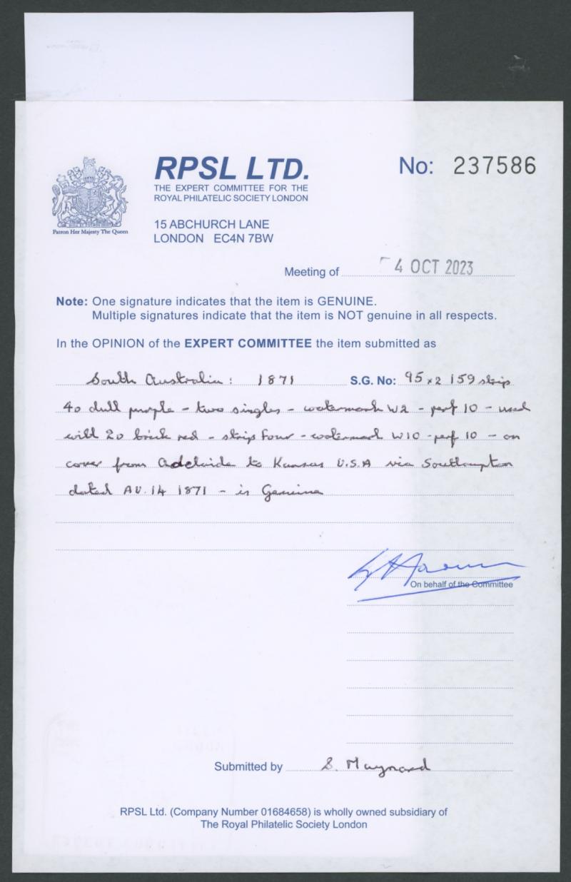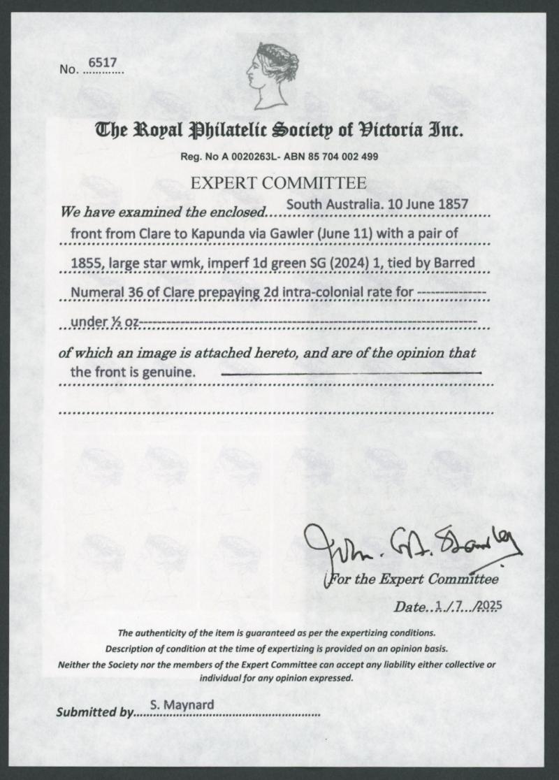 'CLARE/=SOUTH-AUSTRALIA=' cds & similar 'GAWLER' cds of the next day. RPSV Certificate (2025).