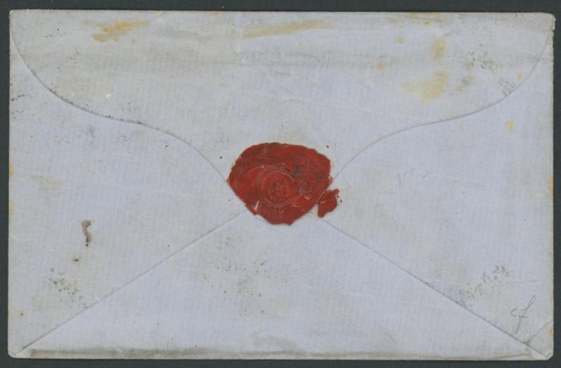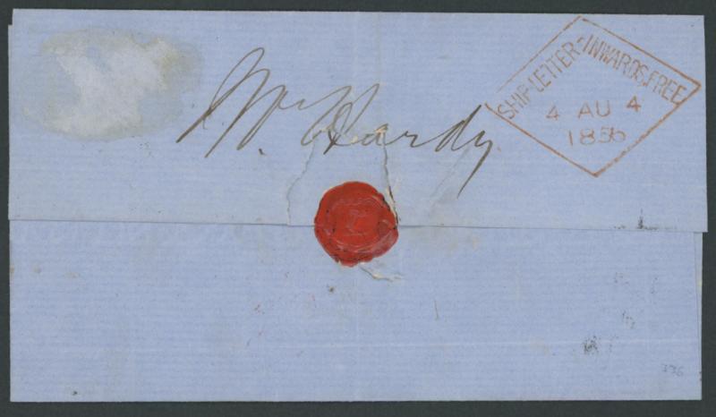 Duty 6d for "Three hundred & nine bars of iron wg. eight tons ten hunderdweight", largely fine strike of 'JB WILCOCKS/ AGENT FOR GOVERNMENT/EMIGRATION/ PLYMOUTH' unframed-oval handstamp on the face, carried per favor and placed into the mails on