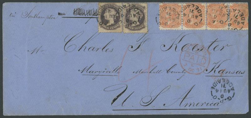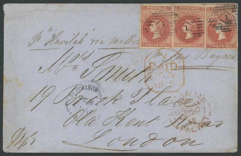(full margins except where a little cut-into at upper-right) tied by circle-in-bars cancels of the GPO with very fine 'PAID/=ADELAIDE SA=' cds & straight-line 'REGISTERED No' handstamp both in red, very fine Inwards Ship Letter datestamps of