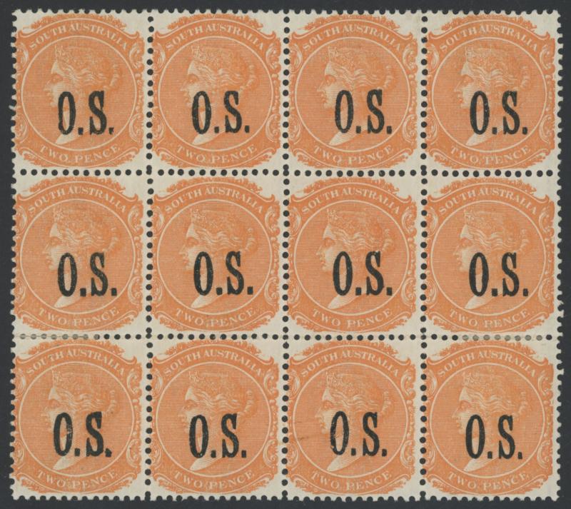 OVERPRINTED THIN 'O.S.' NARROW SETTING: 1891-96 QV De La Rue Perf 13 2d orange SG O59 block of 12 (4x3), well-centred, large-part