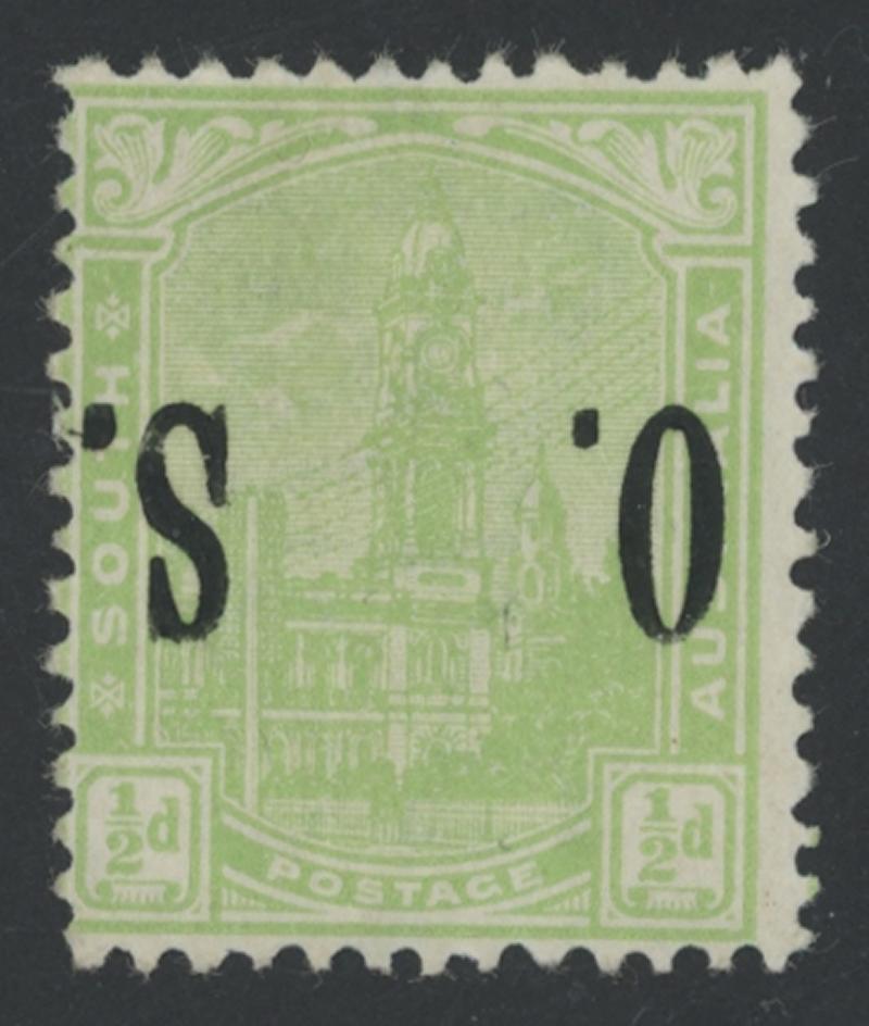OVERPRINTED THIN 'O.S.' WIDE SETTING: 1899-1901 ½d yellow-green Post Office with the Overprint Inverted SG O80a, lightly mounted,