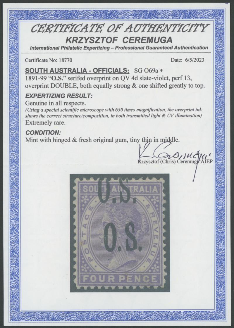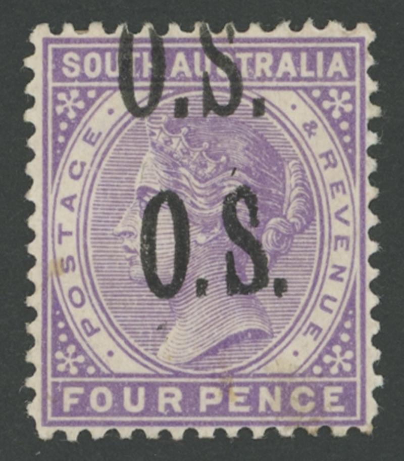 OVERPRINTED THIN 'O.S.' NARROW SETTING: 1891-99 QV De La Rue Perf 13 4d violet with the Overprint Double SG O69a, very