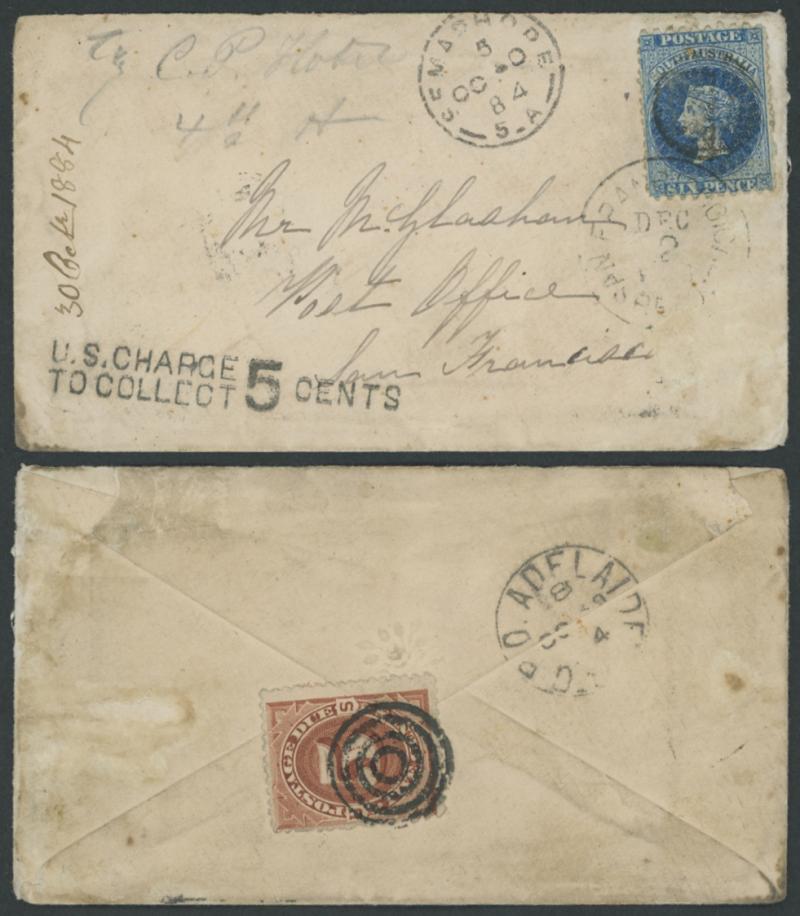 and largely very fine 'SEMAPHORE' framed cds alongside, Adelaide GPO transit backstamp and 'SAN FRANCISCO CAL/DEC 2/REC'D' arrival cds (tying the stamp) where very fine 'U.S. CHARGE/TO COLLECT/5 CENTS' applied on the face for the incoming steamship