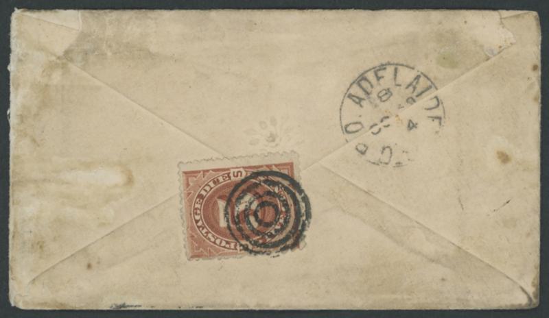 charge, and US Postage Due 5c affixed tied to the reverse by concentric rings cancel, minor blemishes & soiling on the reverse. Ex John Barwis. From -.2.1874, the trans-Pacific rate was reduced from 8d to 6d per ½oz, but the incoming charge remained