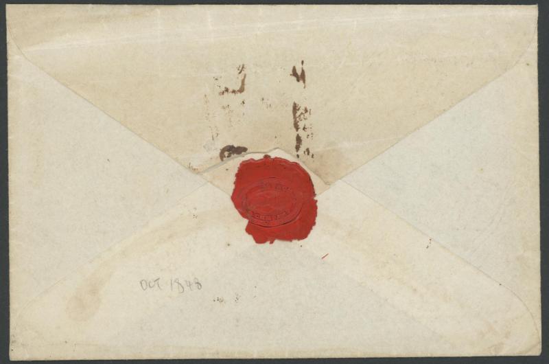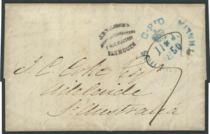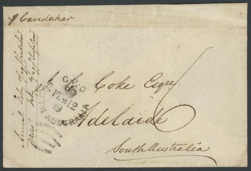 September 1848", to "JC Coke Esq, Adelaide" endorsed "p Candahar" with a largely fine strike of 'JB WILCOCKS/AGENT FOR GOVERNMENT/EMIGRATION/PLYMOUTH' unframed-oval handstamp on the face, carried per favor and placed into the mails on arrival at