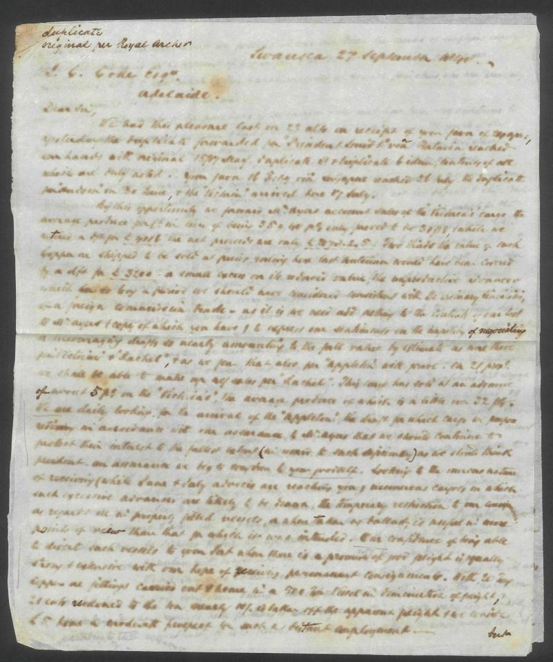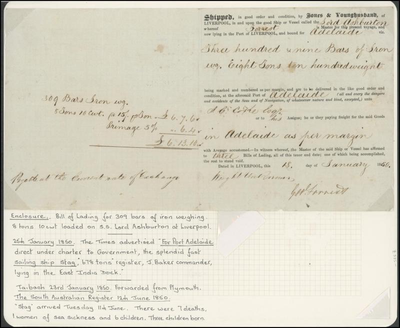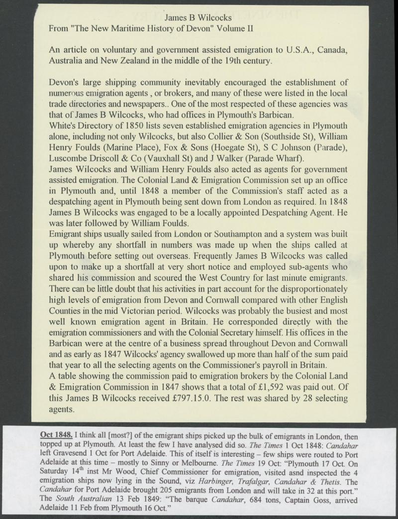 Plymouth 16.10.1848, arriving Adelaide 11.2.1849. James B Wilcocks was one of the more successful agents attracting paying immigrants to South Australia, for which he received a stipend from the South Australian government. See also the next lot and
