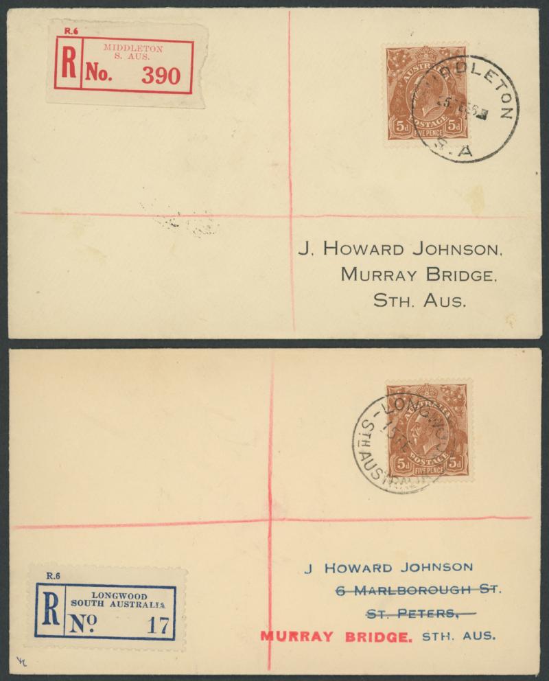 1935-36 Howard Johnson registered covers from 'LONGWOOD', 'LOWBANK' (red/white R label) and 'MIDDLETON' (red/white R label).