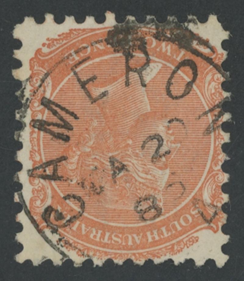 Cameron: squared-circle 'CAMERON/JA20/85/[S]A' (ERD by 7 years) largely very fine strike on QV 2d orange. Rated RRRR. PO 1.9.1882;