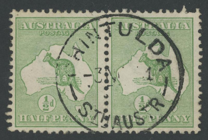 Chintulda: 'CHINTULDA/3NO14/STH AUSTR' (LRD) largely superb strike on Kangaroos ½d green pair. Underrated at RRRR; only one other