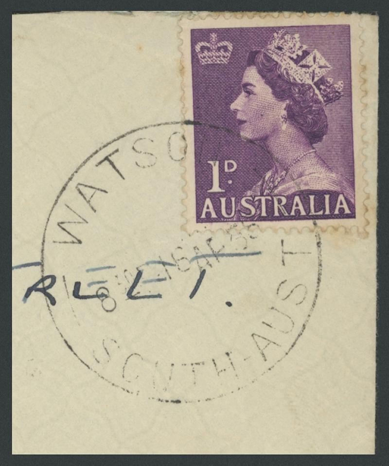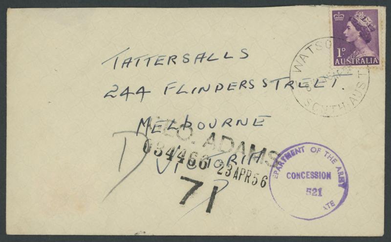 Watson: 'WATSON/830 16AP56/SOUTH-AUST' with time (ERD by two months) light but very fine strike tying QE 1d to Army Concession Rate