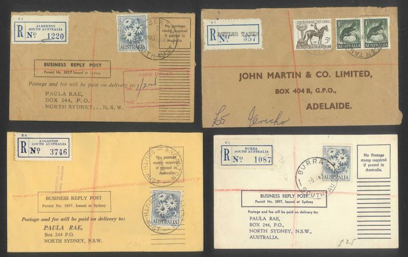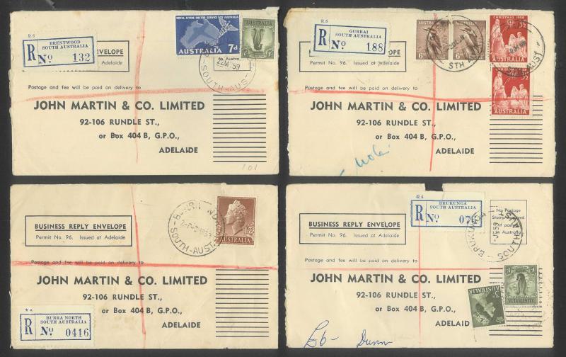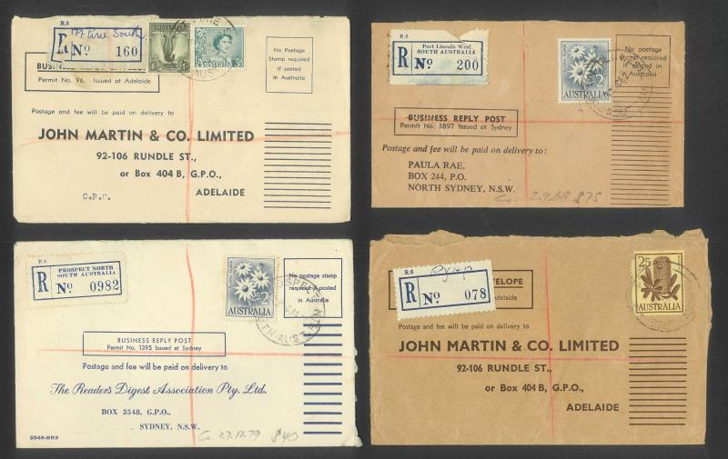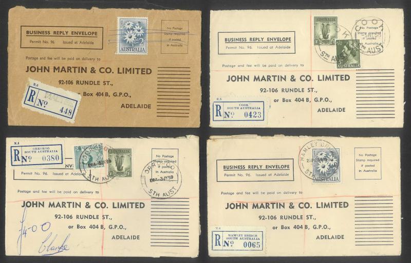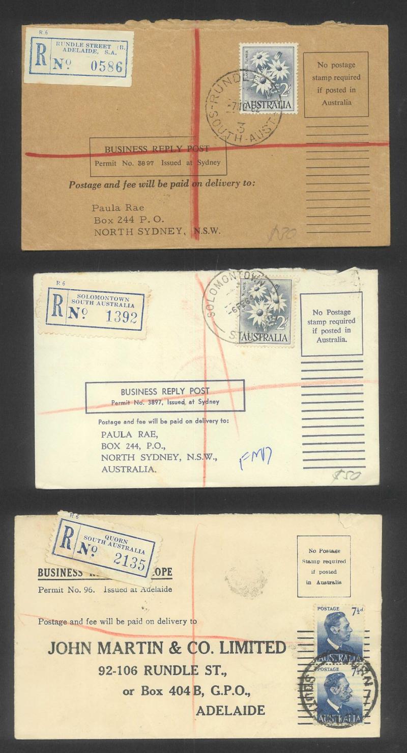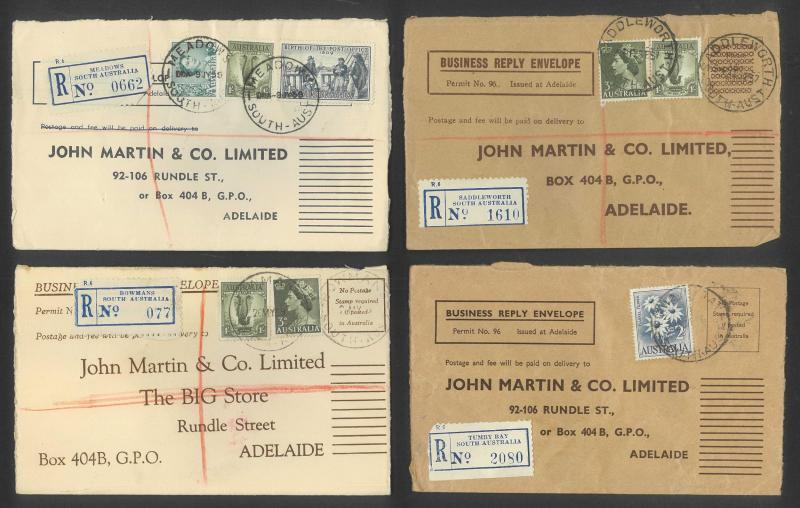 1929-64 Business Reply Post envelopes all registered and mostly from small post offices, those to John Martin (Adelaide) have been