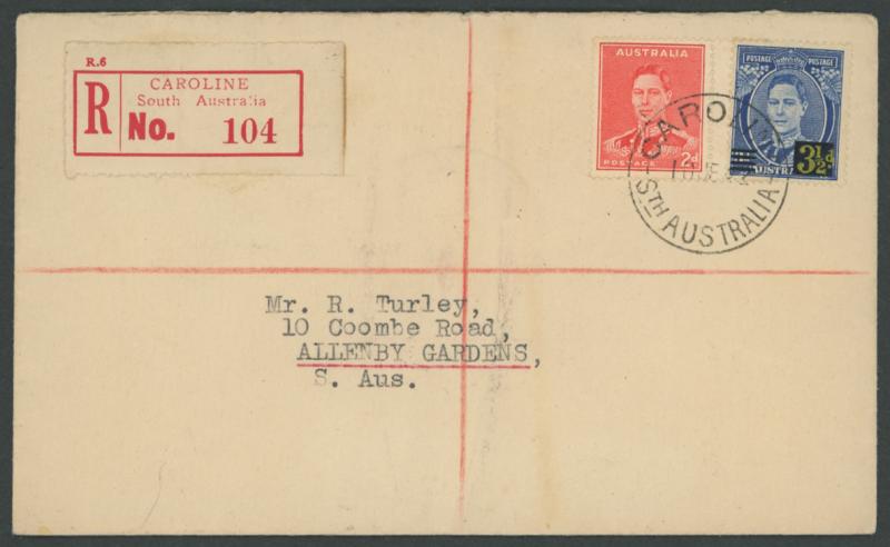 Tatts cover to Melbourne (Tatts dater of '23APR56'). Underrated at RRR; Handbook records it for only four days & this is the only example we have seen. TO 31.5.1955; PO 8.8.1955; closed 11.8.1956. 38km SW of Maralinga Atomic Testing Range (but today