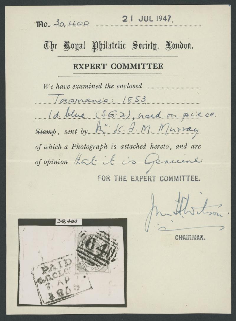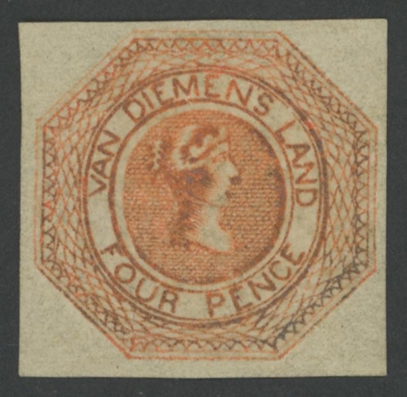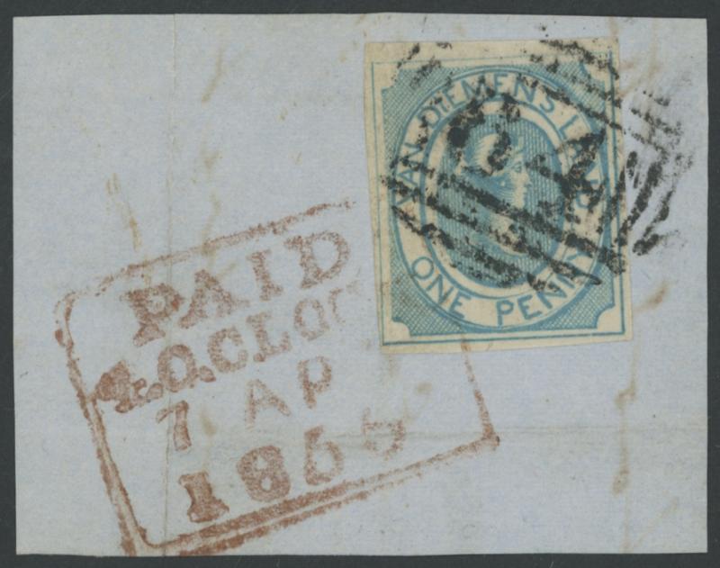 sides, tied to piece by BN '64' and rounded-boxed 'PAID/4.O.CLOCK/7AP7/1855' datestamp in red both of Hobart Town, Cat £1500 plus a premium for being on piece. A very attractive & desirable item. RPSL Certificate (1947). (Image1) (Image2)