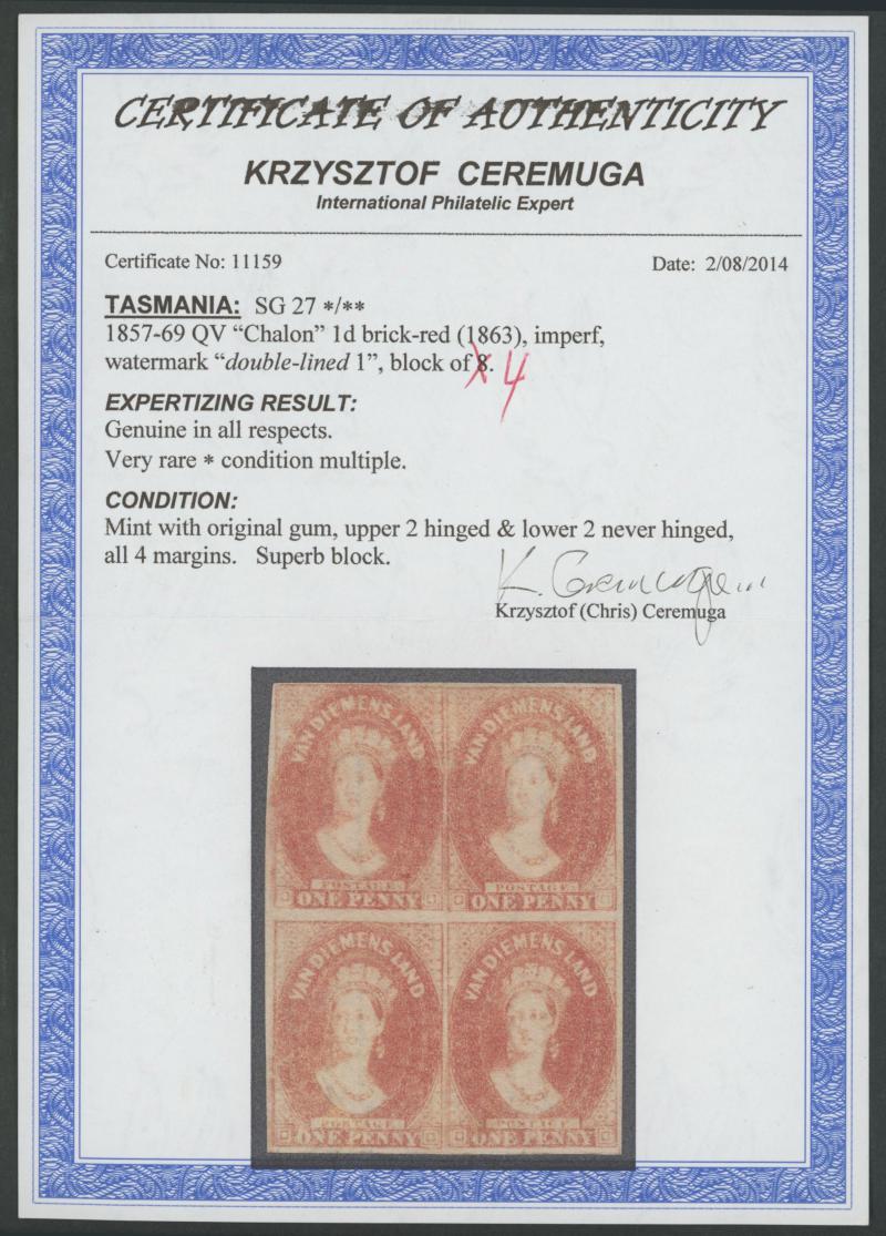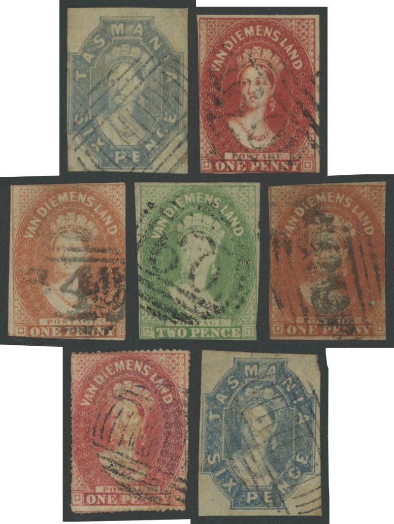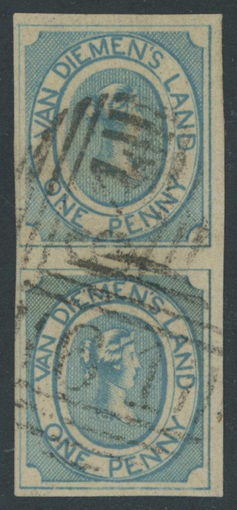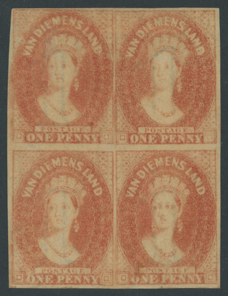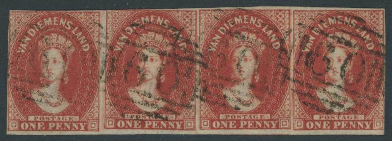 remarkable, BN '60' cancels of Launceston, Cat £3600+ for singles. Ex Alfred Caspary, John Bell (NSW) - sold in 2009 for $5290 (Sale 150 Lot 303) - and 'Dubois' Part III: sold for SFr2195. The equal-largest multiple recorded: John Bell stated "Used,