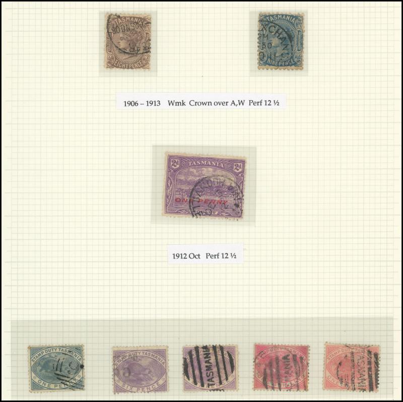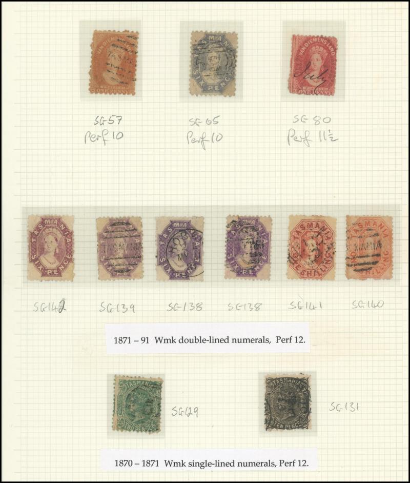 selection x8, 'TASMANIA' 6d x2 & 1/-, some with less than full margins, and 1863-71 Experimental Separations group x21 (not checked by us) including Serrated Perf 19 1d SG 118, all apparently postally used but nothing has been expertised, Cat £7000