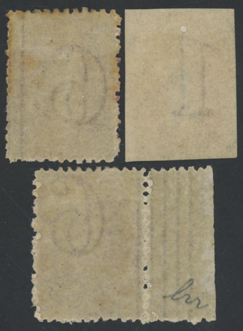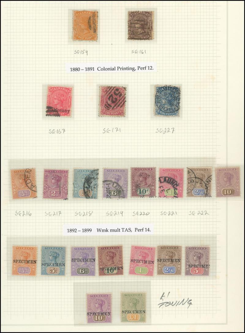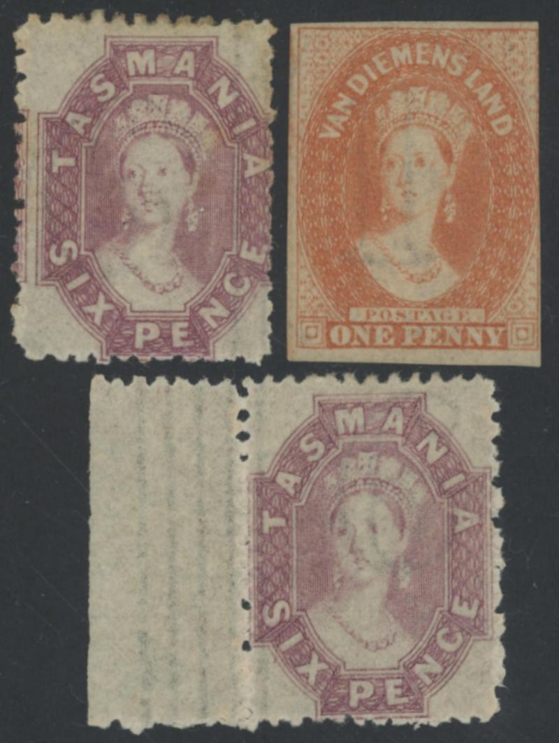 £925; also 'TASMANIA' Perf 11½ 6d dull reddish lilac SG 139, apparently unused, Cat £200 and Perf 12 6d dull claret SG 143, Cat £55, large-part gum.