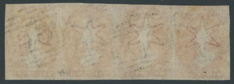 1855 QV Chalons Large Star 1d carmine SG 14 horizontal strip of 4, margins just touching to large, the third unit is quite
