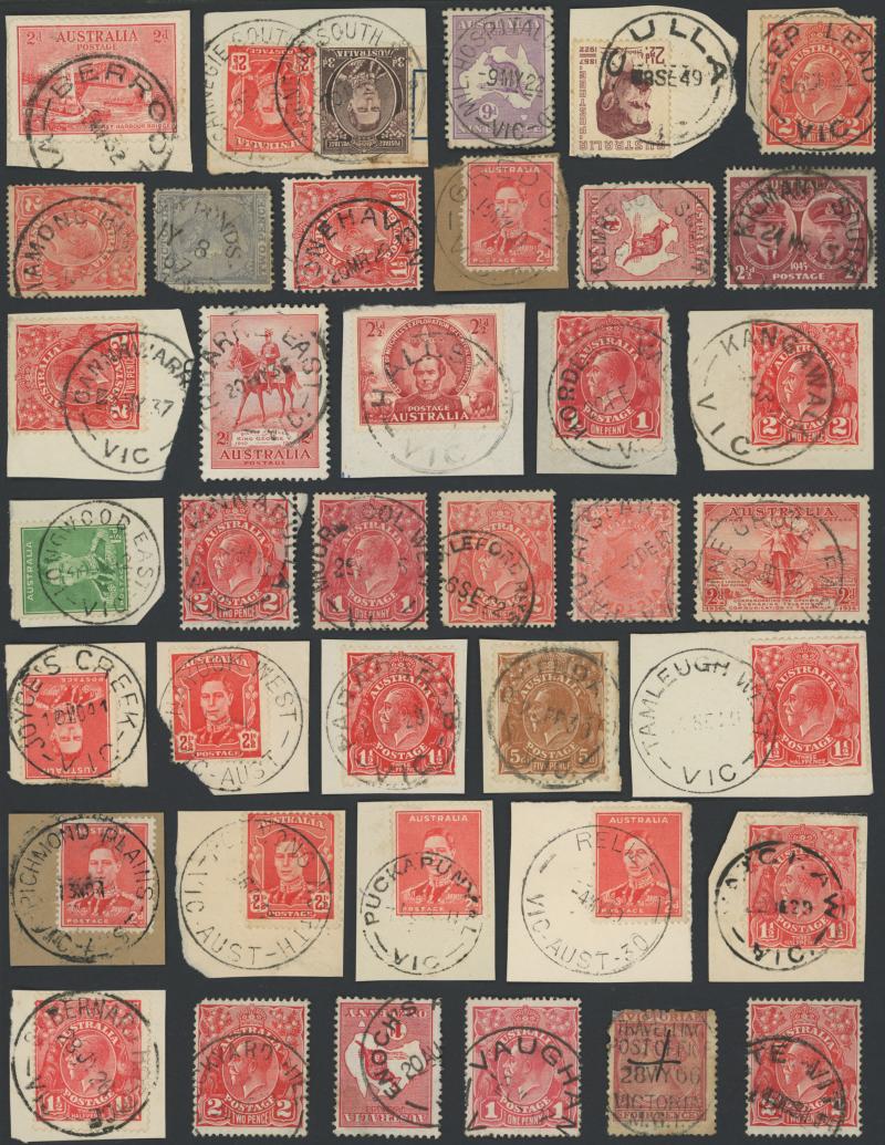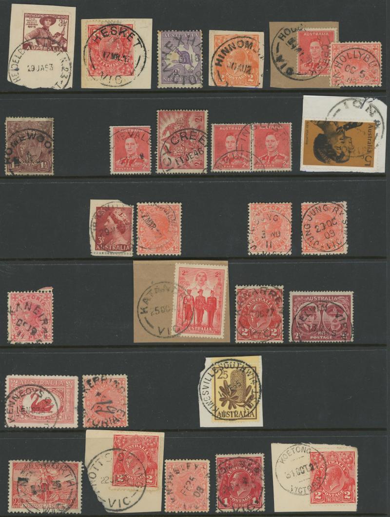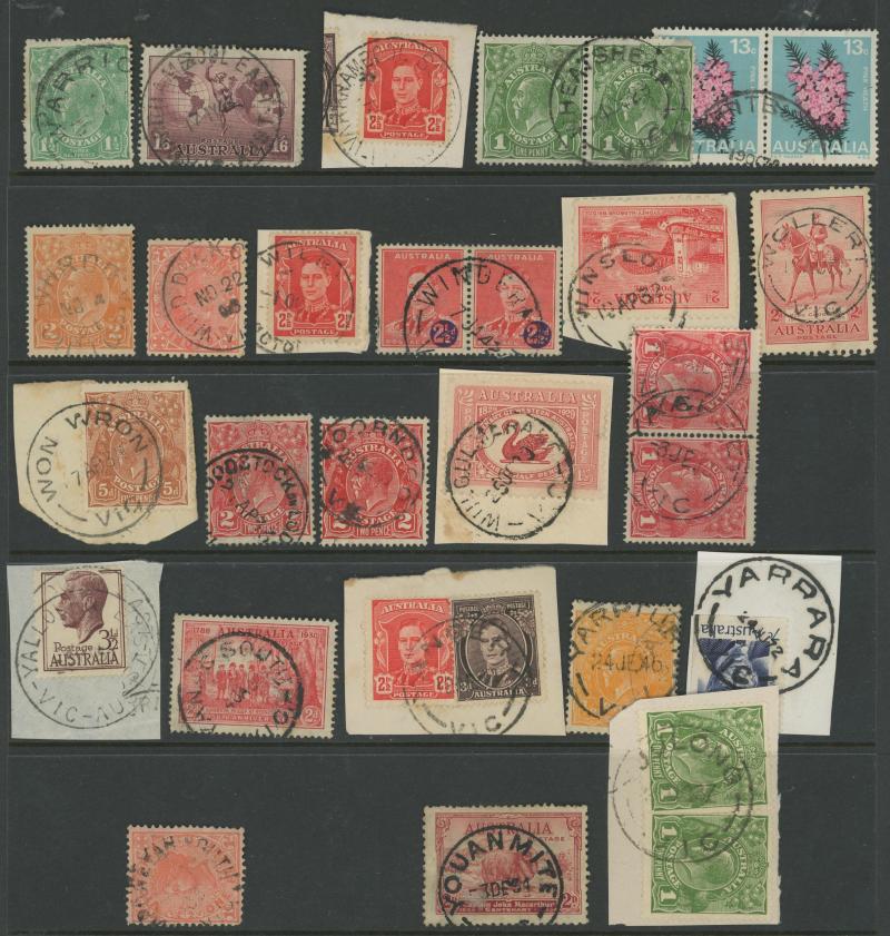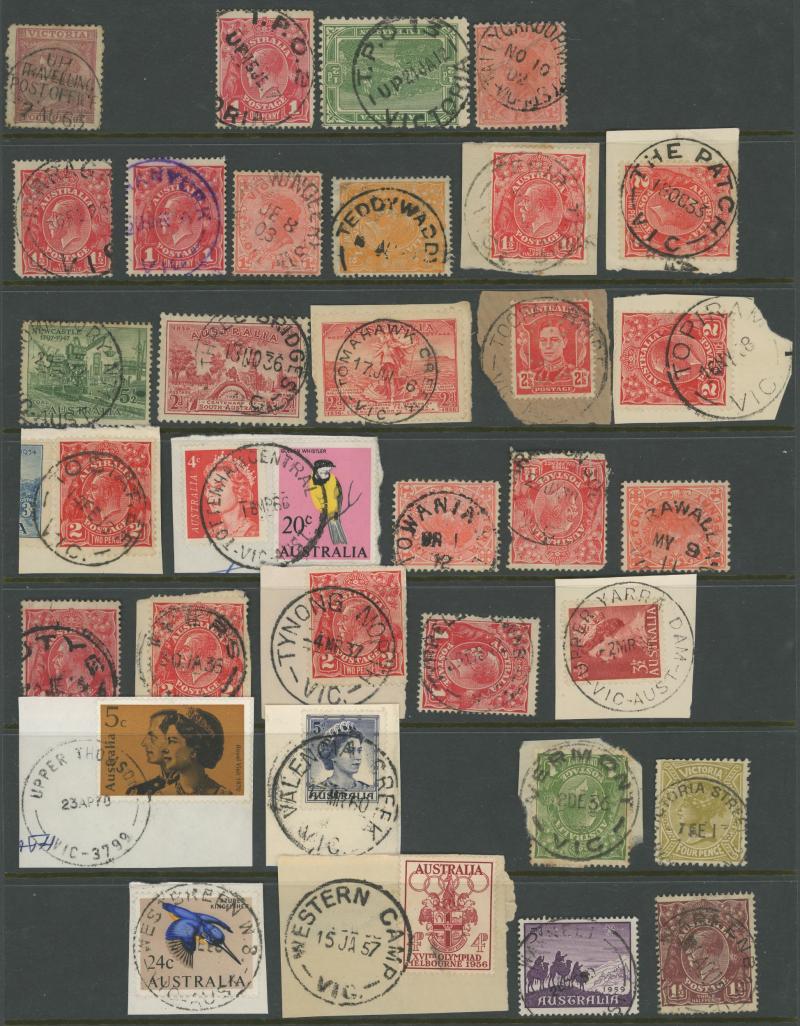 NTH', 1915 'MOORMBOOL WEST' (R.O. period), 1922 '[MUC]KLEFORD RLY S[TN]', 'NAYOOK WEST/VIC-AUST' (the second example recorded), unframed 'NORVAL', 'PARAPARAP', 27½mm 'PARWAN', 'PINE GROVE EAST', 'POOWONG NORTH', 'PUCKAPUNYAL', 'RELIEF/VIC-AUST-30',