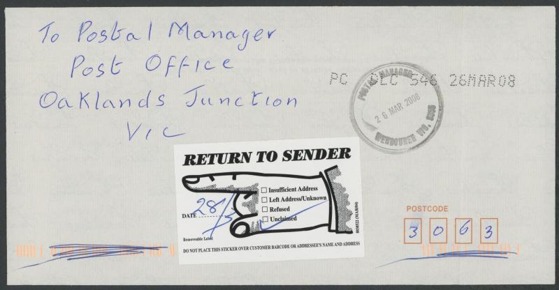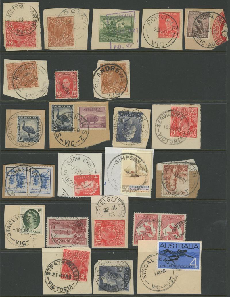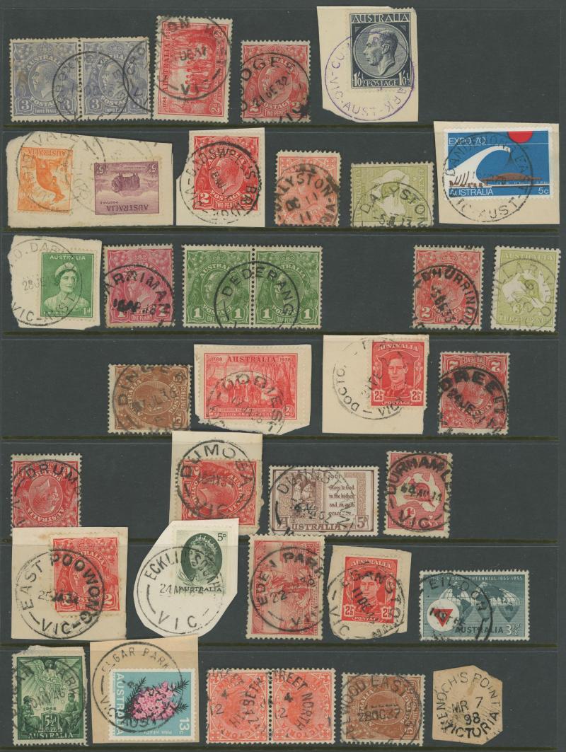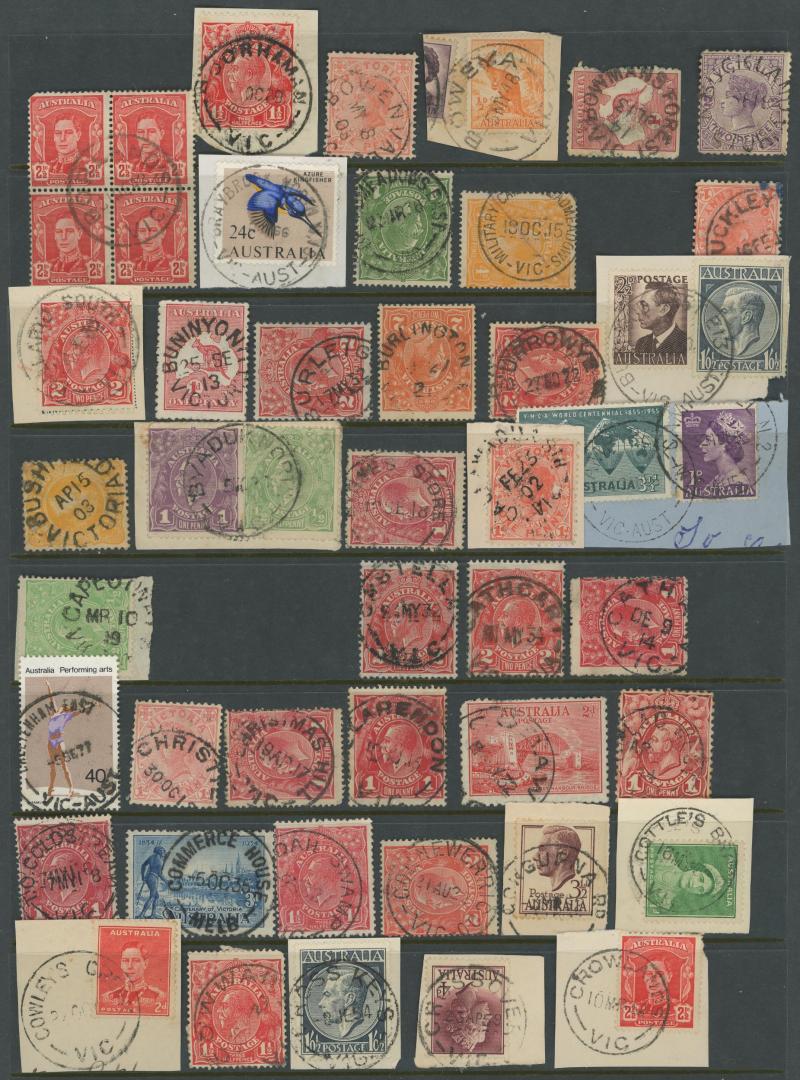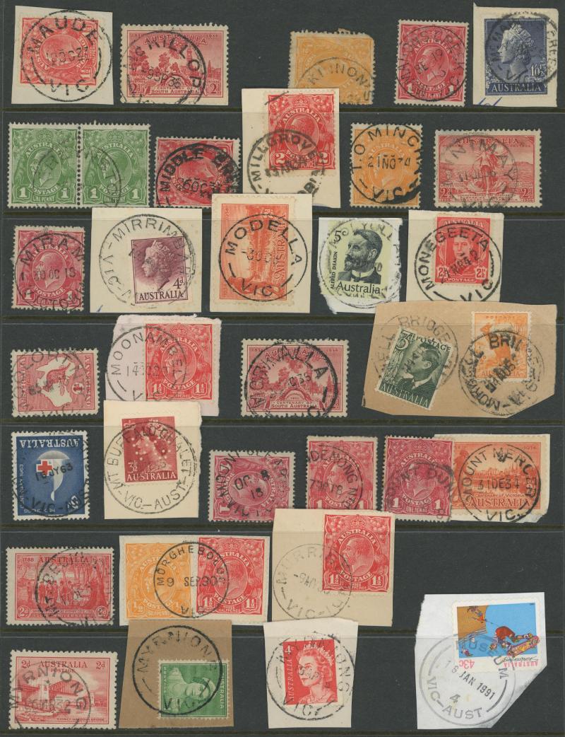 NTH', 1915 'MOORMBOOL WEST' (R.O. period), 1922 '[MUC]KLEFORD RLY S[TN]', 'NAYOOK WEST/VIC-AUST' (the second example recorded), unframed 'NORVAL', 'PARAPARAP', 27½mm 'PARWAN', 'PINE GROVE EAST', 'POOWONG NORTH', 'PUCKAPUNYAL', 'RELIEF/VIC-AUST-30',