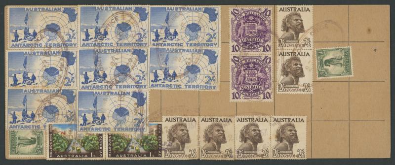 Melbourne: double-oval 'MONEY ORDER OFFICE/27SEP1957/GPO MELB C1' datestamp multiple fair to fine strikes on Lyrebird 1/- x2,