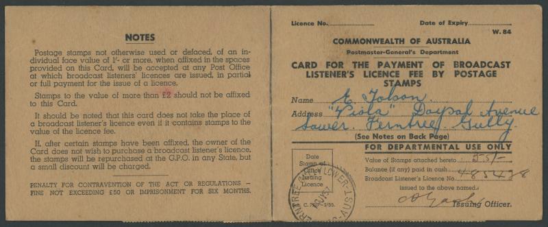 Olympics 1/- pair, AAT 2/- x8, Aborigine 2/6d x6 & Arms 10/- pair within a Broadcast Listener's Licence Fee booklet. (Image1) (Image2)