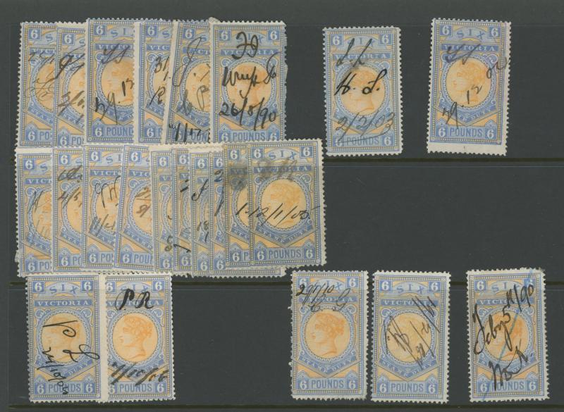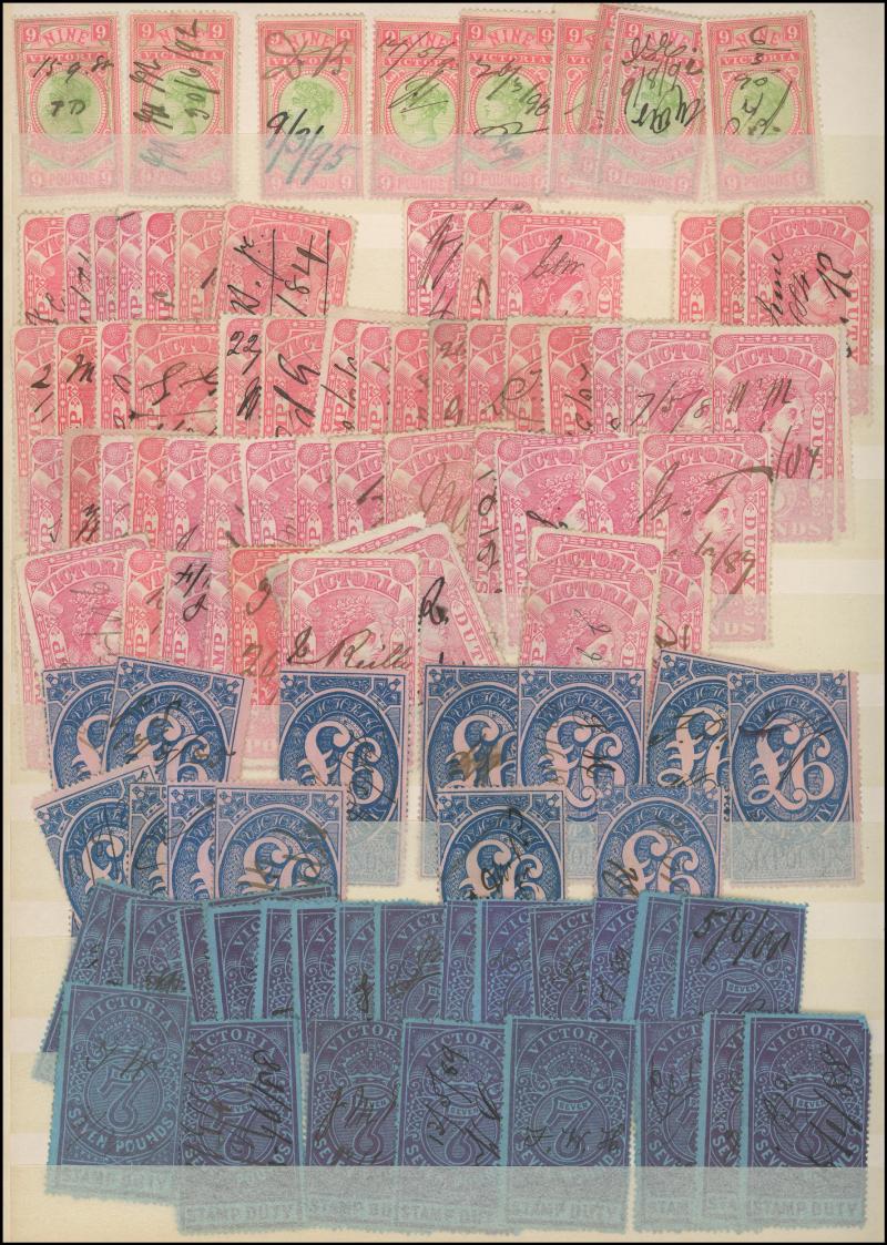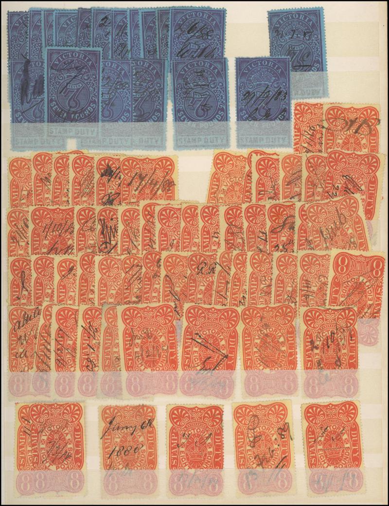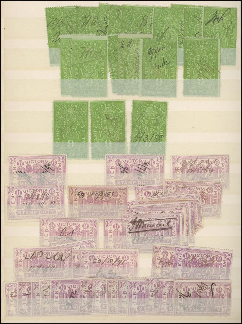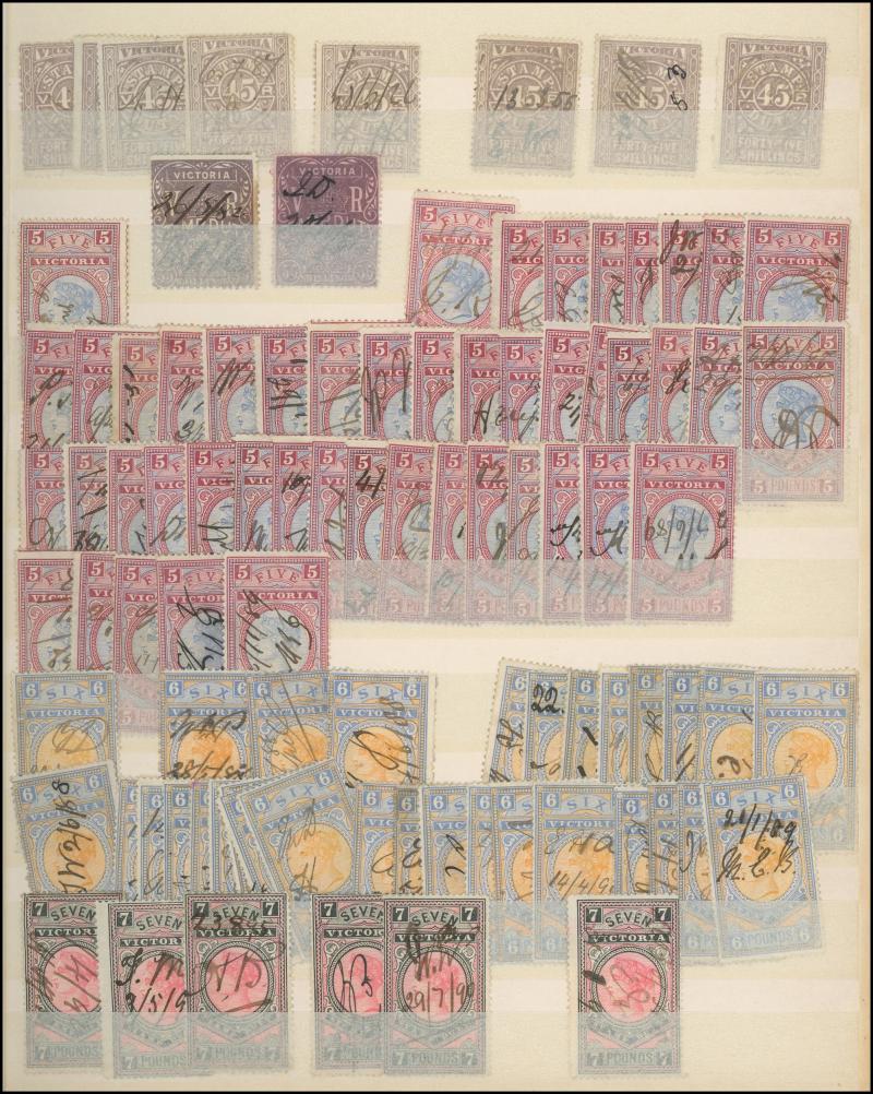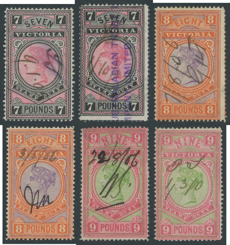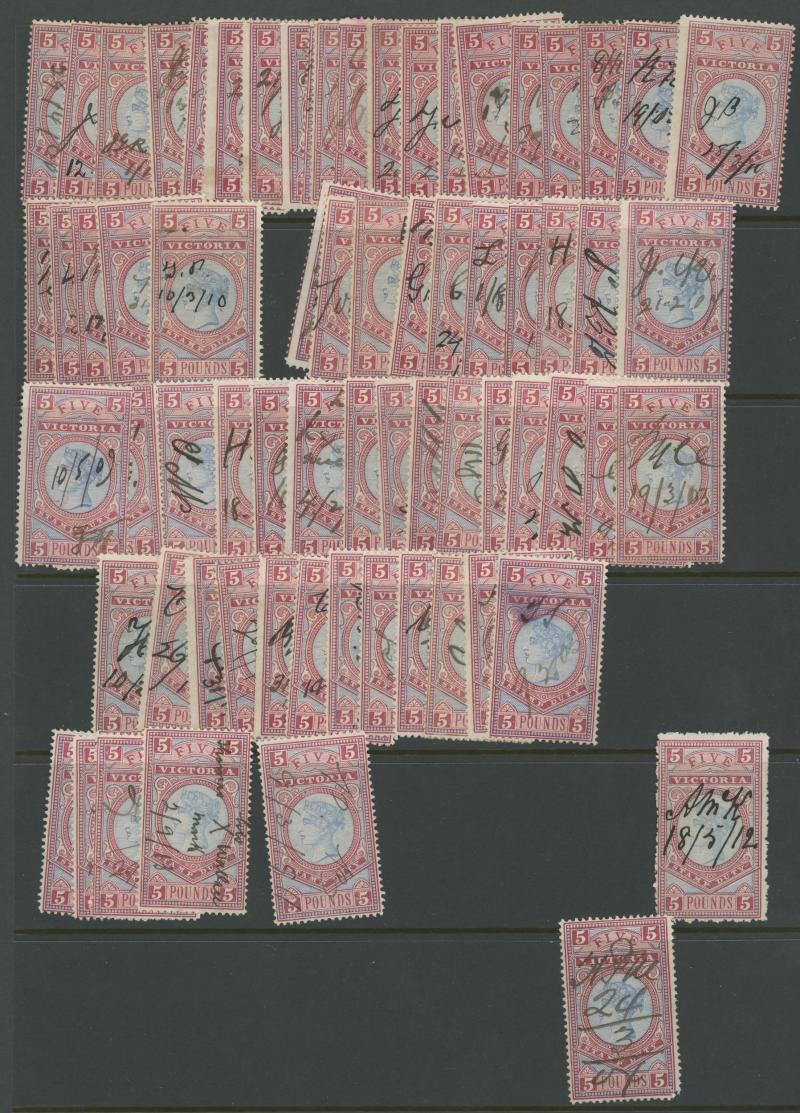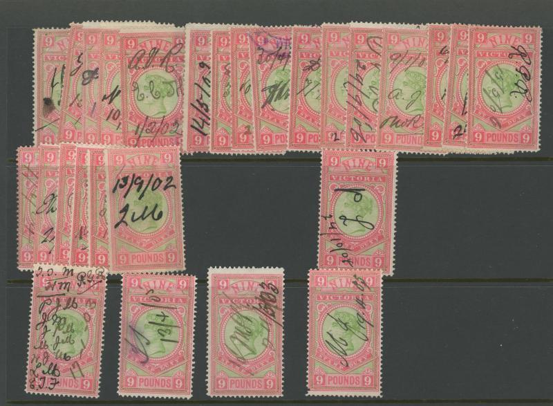 REVENUES: Remarkable duplicated stock with 35/- x6, 45/- x8, Oversize £6 x13, £7 x42, £8 x57 and £9 x20, 1886-96 Bicolours £5 x47,
