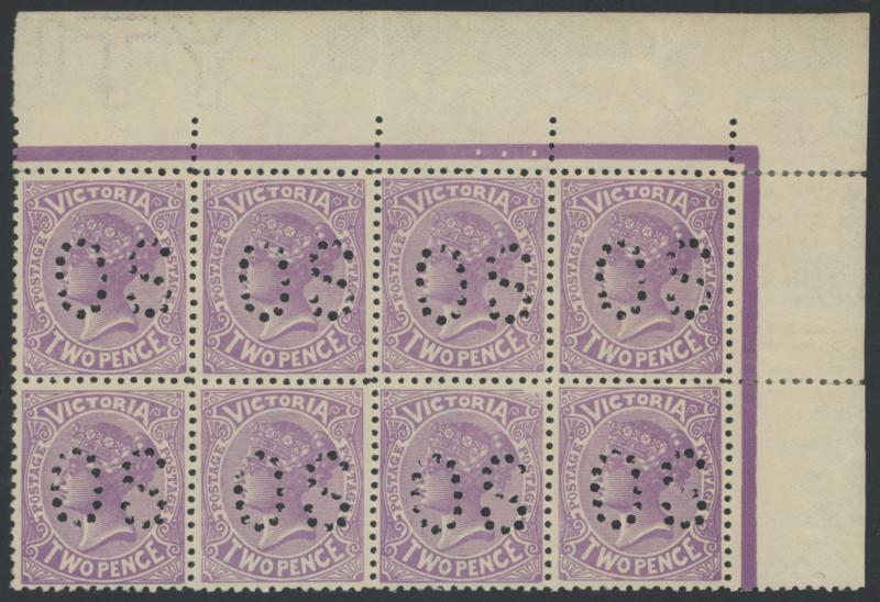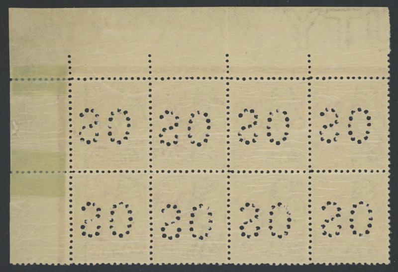 1905-13 QV 'POSTAGE' Crown/A Wmk Perf 12x12½ 2d violet SG 418c punctured 'OS' corner block of 8 (4x2) from the top of the sheet