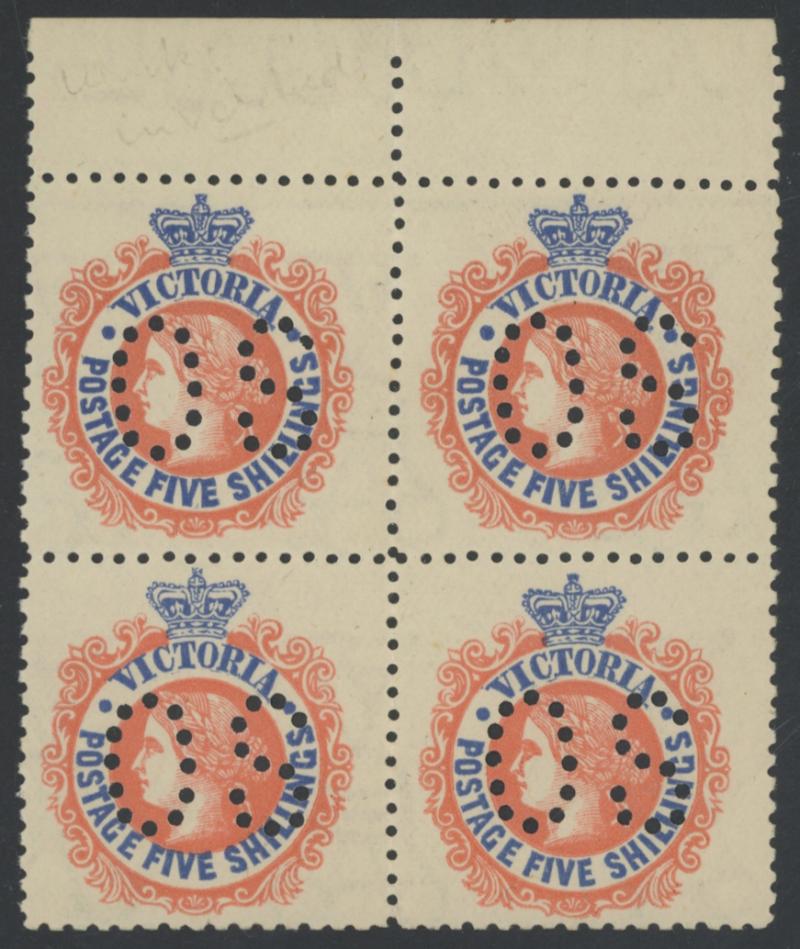 1905-13 QV 'POSTAGE' Crown/A Wmk Perf 12½ 5/- rose-red & blue SG 430a with the Watermark Inverted and punctured 'OS' ACSC V128Baba