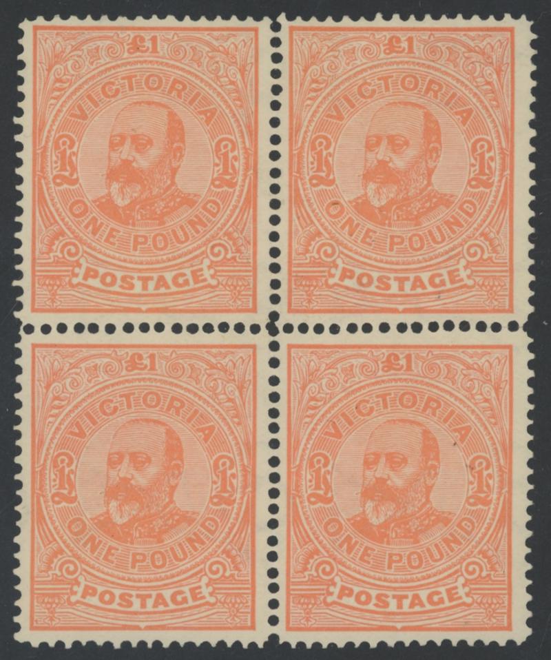 1905-13 KEVII 'POSTAGE' Crown/A Wmk Perf 12½ £1 salmon SG 431 (ACSC V132A) block of 4, well-centred, very fresh and lightly