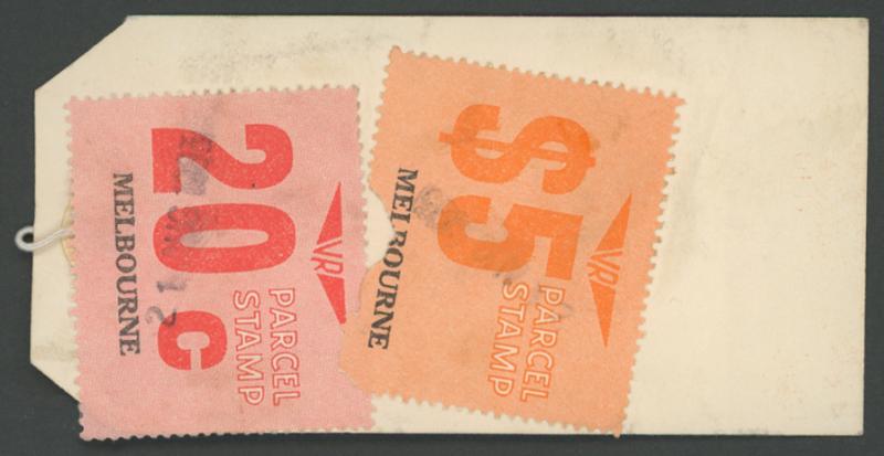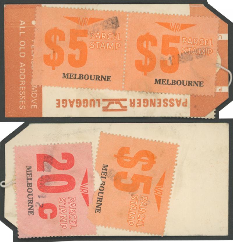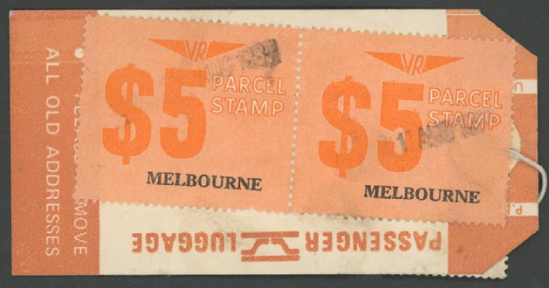 RAILWAY STAMPS: 1981 Victorian Railways 'Passenger Luggage' tag with 'MELBOURNE' 20c red & $5 orange single (faulty) & horizontal