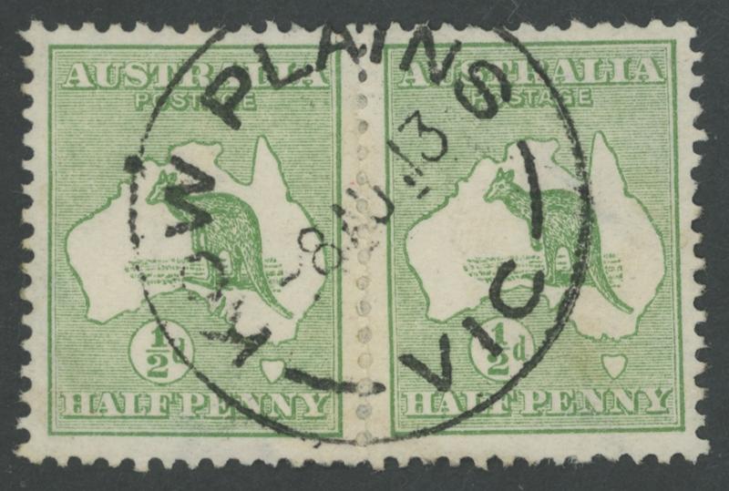 Kow Plains: 'KOW PLAINS/08AU13/VIC' cds largely very fine virtually complete strike on Kangaroos ½d green horizontal pair. Very