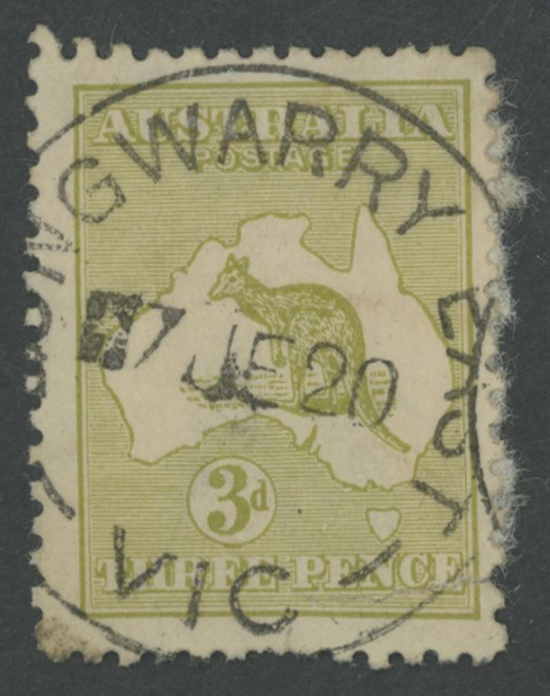 Longwarry East: 'LONGWARRY EAST/-7JE20/VIC' cds (LRD) very fine largely complete strike on Kangaroos 3d olive. Rare. RO circa 1902;
