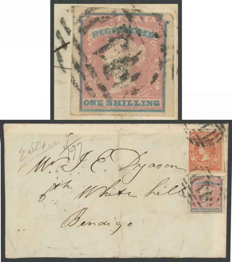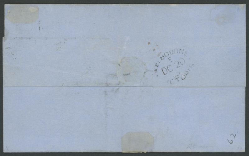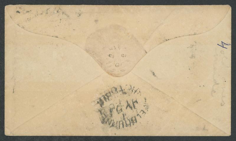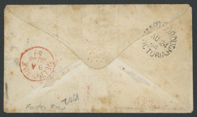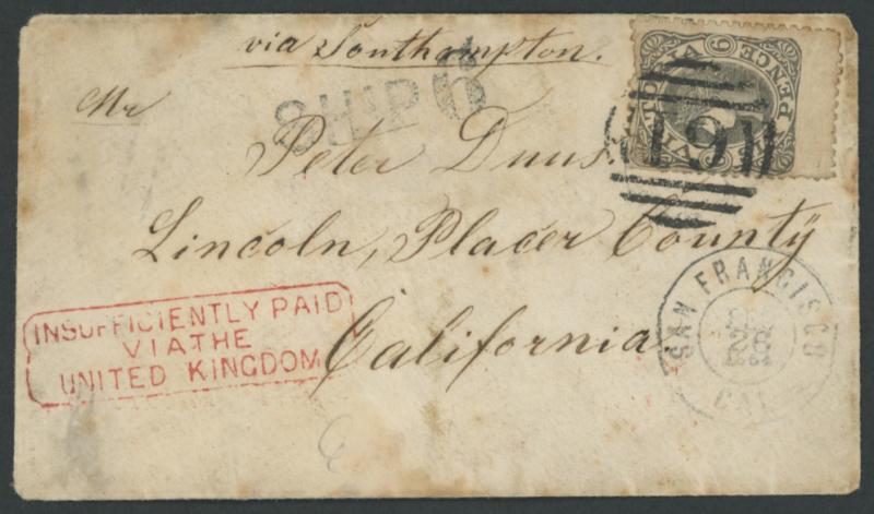Melbourne in red and carried instead trans-Pacific by private ship with San Francisco 'DEC/26/1864' double-ring cds and 'SHIP 6' postage due handstamp both on the face, a little soiled. Ex Dale Forster. Maryborough PO 19.10.1854 [Gold Mining]. Ben