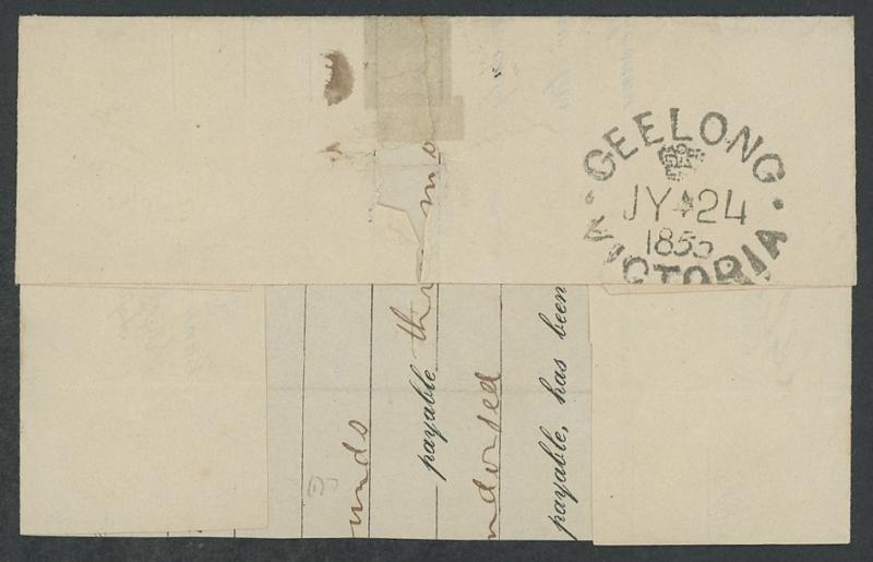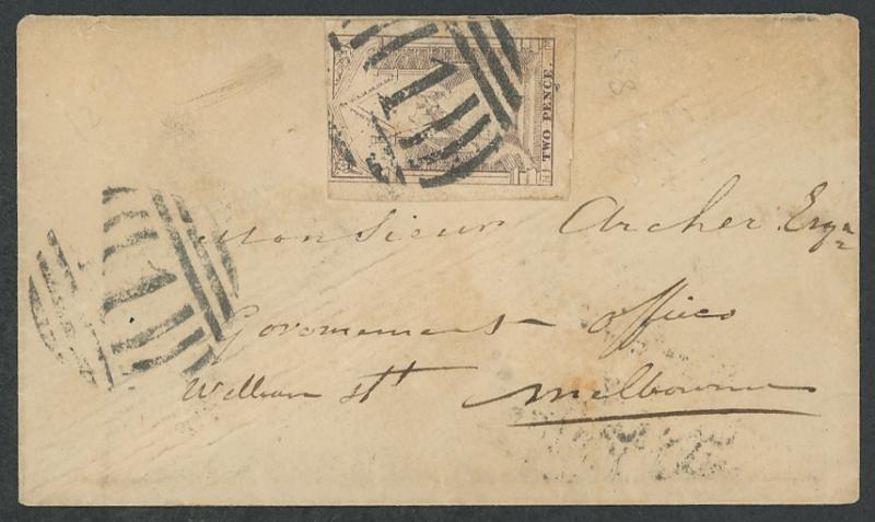 Barred Oval '2' of Geelong (crowned oval backstamp), small internal tape repair stain does not affect the stamp or markings. A very scarce provincial town letter, plus (July 26) small Ladies' envelope to "Monsieur Archer Esq, Government Offices,