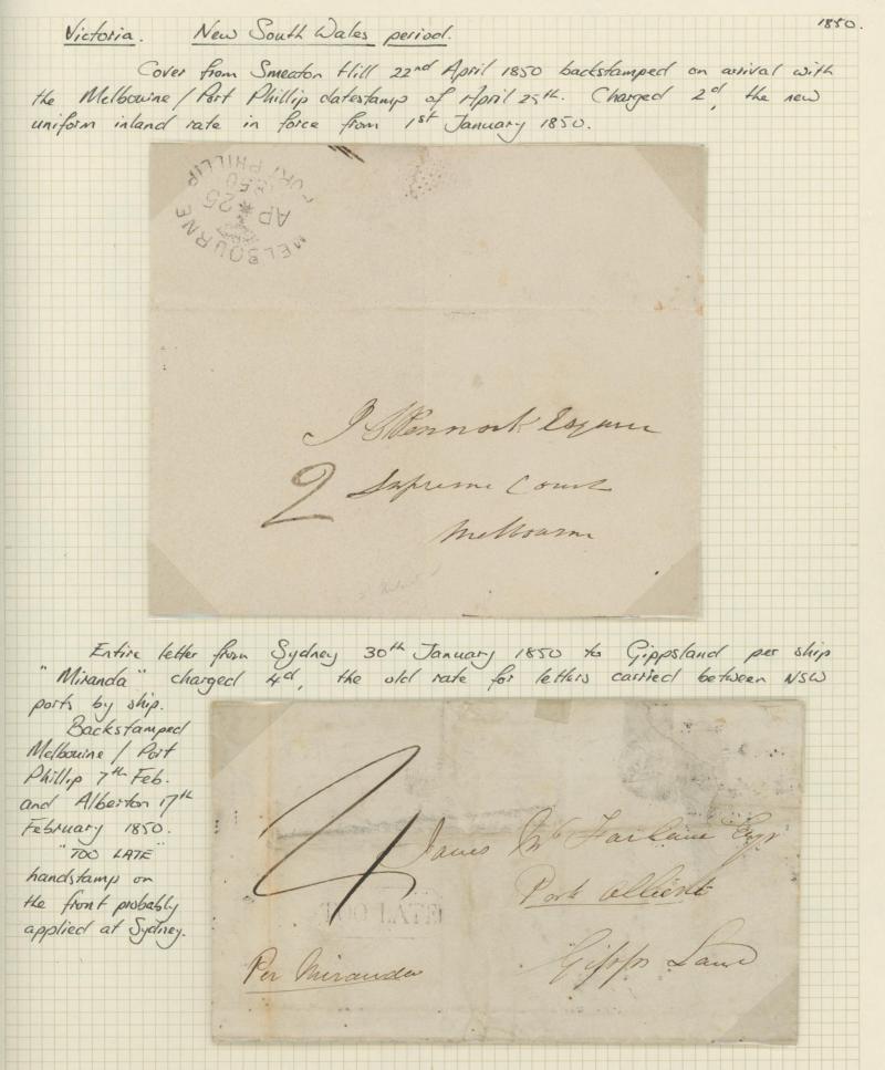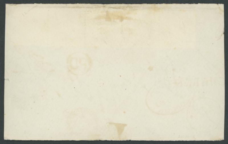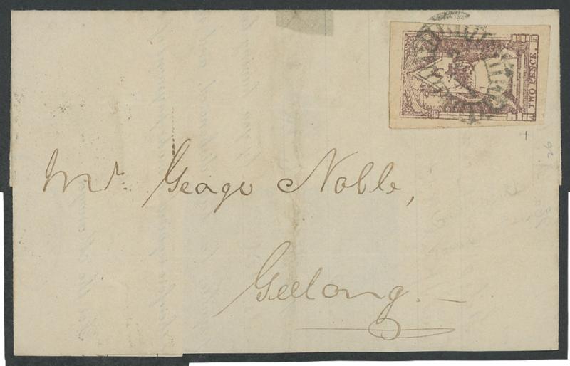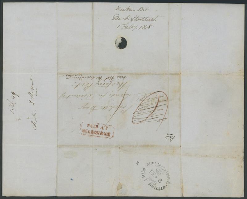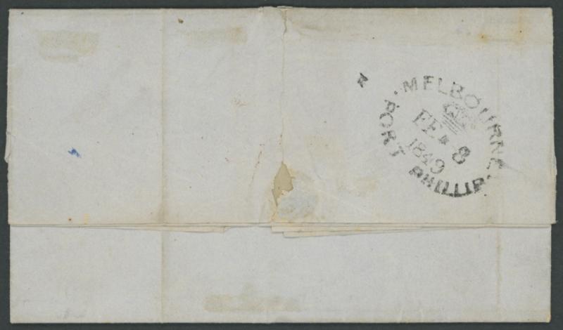 crowned-oval 'MELBOURNE/ FE*8/1849/PORT PHILLIP' arrival backstamp, initially rated "6"[d] in red but crossed-out and re-rated "1"[d] for a town letter, ironed-out vertical filing folds & minor blemishes. Ex Max Watson & Brian Peace: sold at our