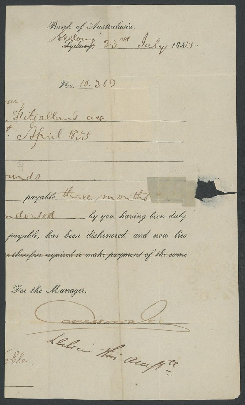 1854 (July 24) large-part Bank of Australasia notice with Queen-on-Throne 2d purple 'AF' Pos [26] (margins close to large) tied by
