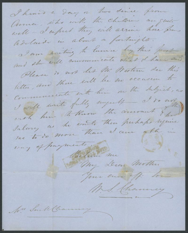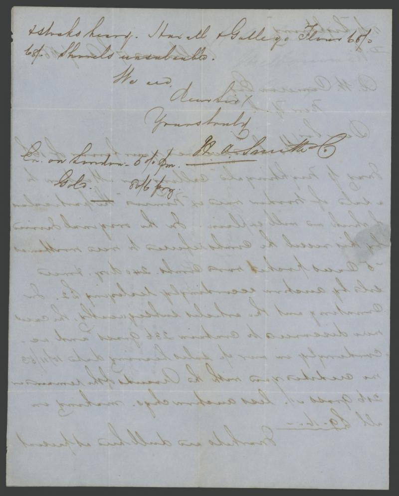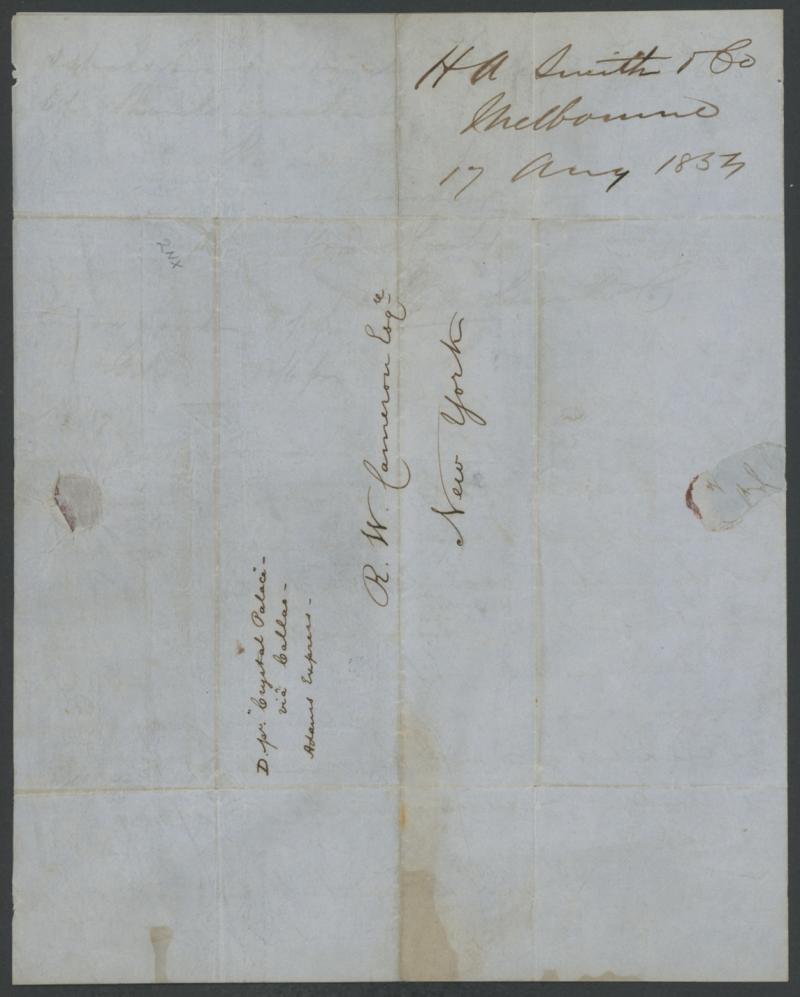 Palace/via Callao/Adams Express" and carried outside the mail, minor soiling & light horizontal fold. Very scarce trans-Pacific Express Company mail. The sender states gold is at "80/6d" (£4/6/-) per ounce. (Image1) (Image2)