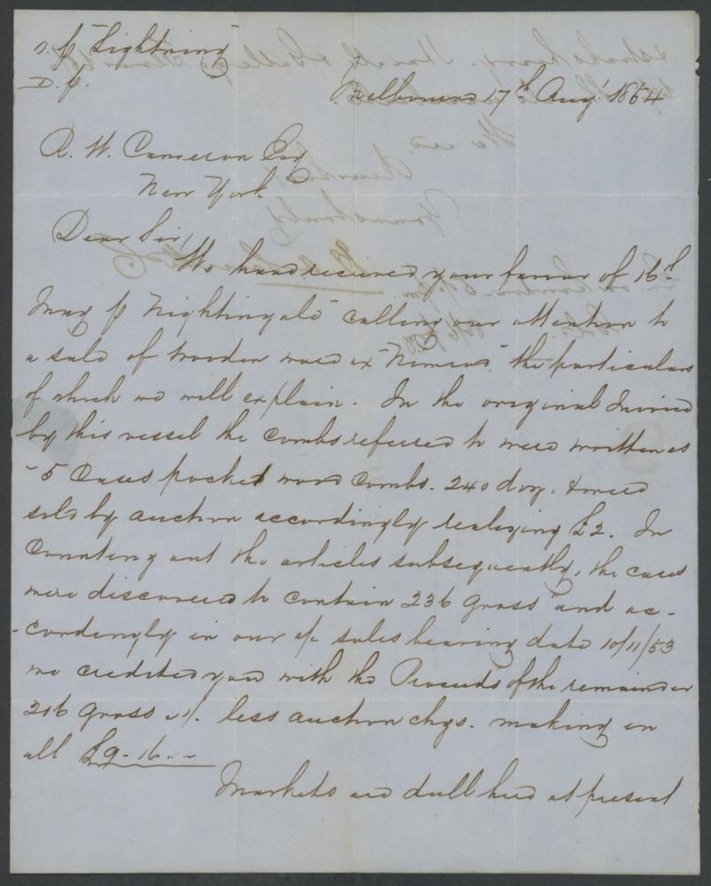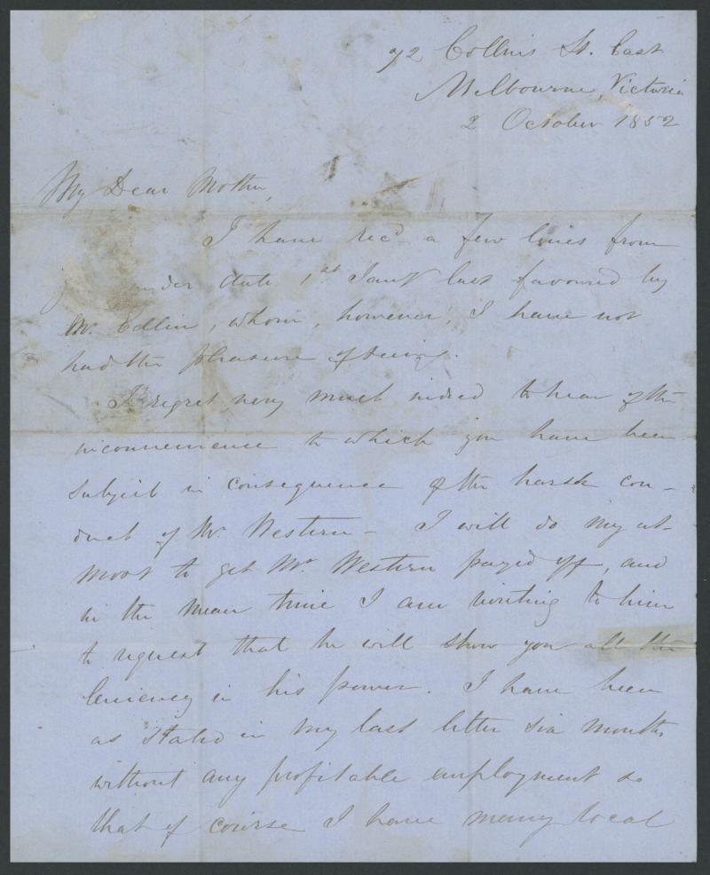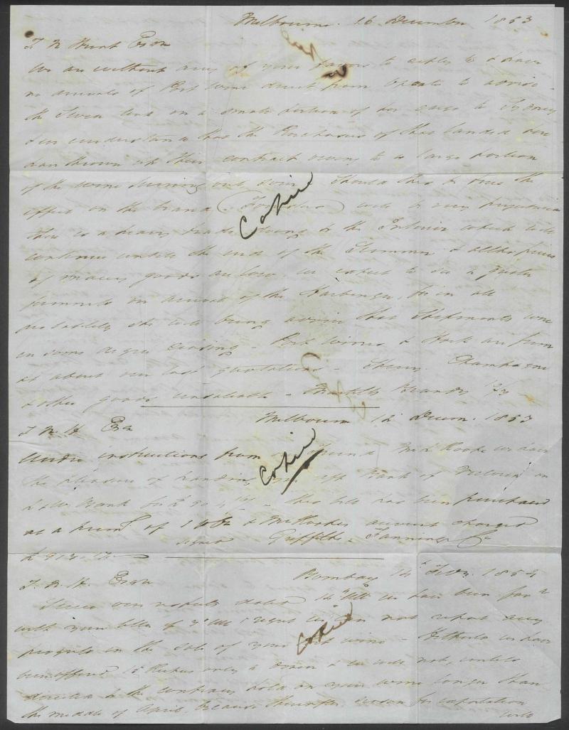 1852 (Oct 2) entire letter headed "72 Collins St East, Melbourne, Victoria" endorsed "Ship Letter", to London with light Melbourne