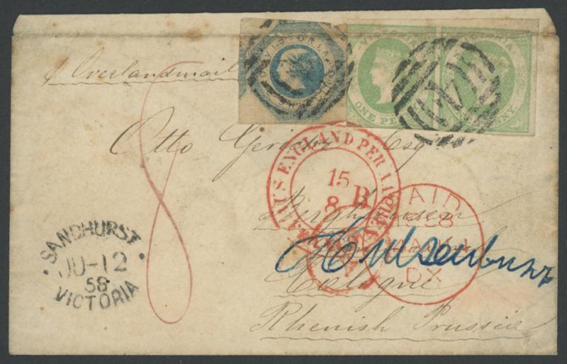 pair & Octagonal 1/- blue tied by two strikes of Barred Numeral '4' and oval 'SANDHURST/VICTORIA' datestamp at lower-left, carried via London where endorsed "8"[d] credit to Great Britain with 'PAID/1858/14AU14/DX' transit in red slightly overstruck