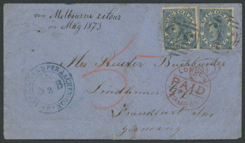 '72', 'SALE/VICTORIA' unframed cds & Melbourne transit of 'SE-9/63' in red backstamps, 'LONDON/NO 20/63/PAID' transit and 'PD' [= Paid to Destination] oval handstamp both in red on the face, 'AUS ENGLAND PER AACHEN/FRANCO' [= from England via Aachen