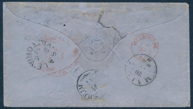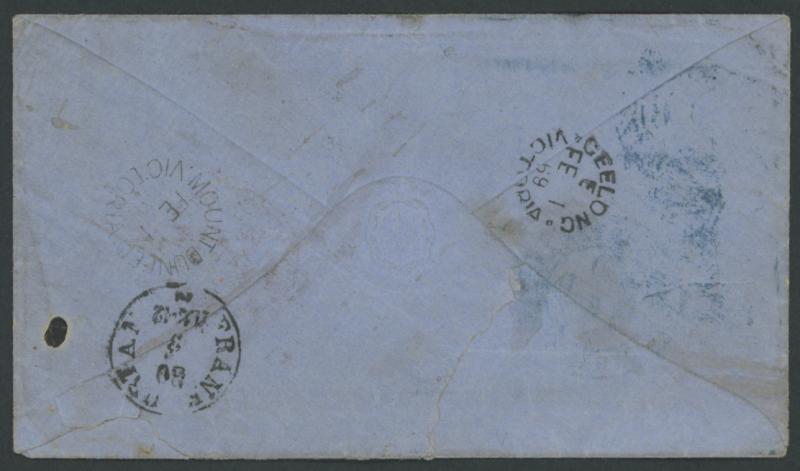 and largely very fine 'MOUNT DUNEED/VICTORIA' backstamp, Geelong transit alongside and London 'PAID/29MR69' cds in red on the face with 'PD'-in-oval [= Paid to Destination] handstamp alongside, largely very fine strike of 'AUS ENGLAND PER