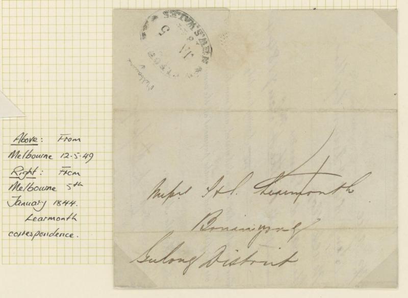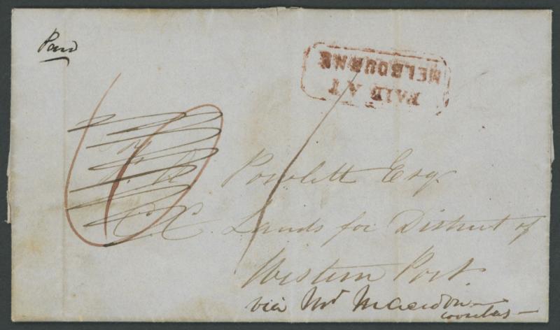 [= Commissioner for Crown] Lands for District of Western Port" at Melbourne endorsed "Paid" at top and "via Mt Macedon coaches" at base in a different ink, largely fine 'PAID AT/MELBOURNE' bevelled-boxed handstamp in red and largely very fine