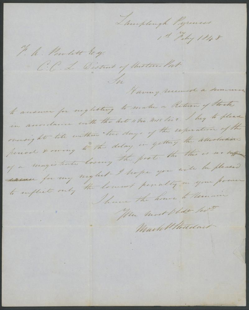 1849 (Feb 1) entire letter headed "Lamplough Pyrenees/1st Feby 1848" (error for '1849') " and signed "Mark P Stoddart", to the "CC