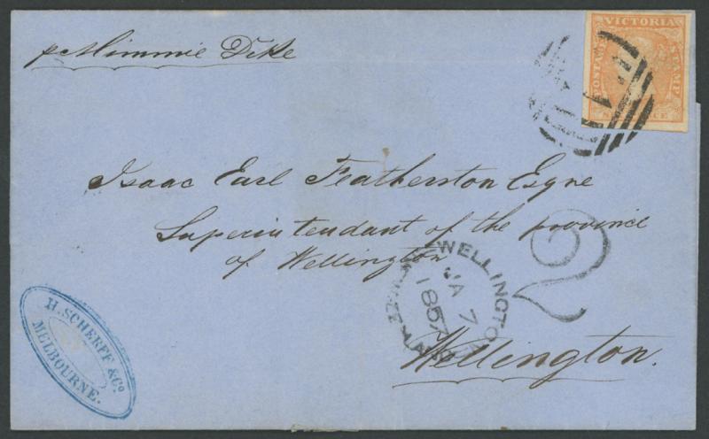 1856 (Dec 20) outer with 'H SCHERFF & CO/MELBOURNE' cachet at lower-left, to New Zealand endorsed "per Mimmie Dike" (schooner) at