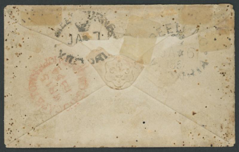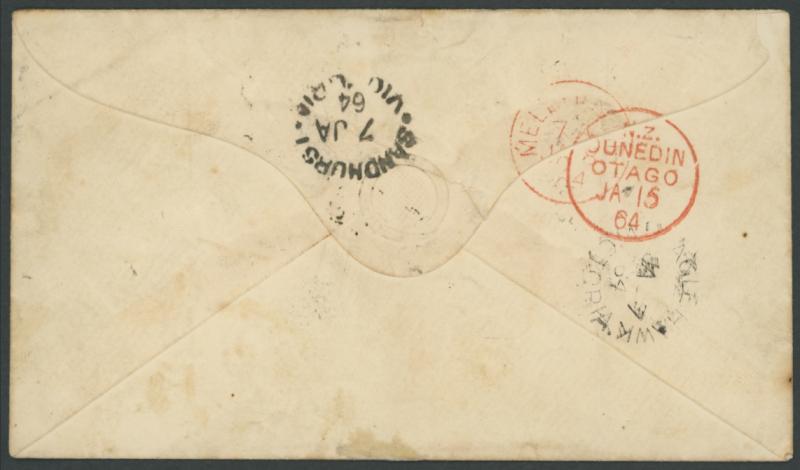 by untidy Barred Numeral First Type '136' (rated RR) with light but fine 'EAGLEHAWK/VICTORIA' small oval backstamp, fine 'SANDHURST/VICTORIA' small oval and very fine 'NZ/DUNEDIN/OTAGO/JA 15/64' transit backstamps alongside, rated '2'[d] handstamp