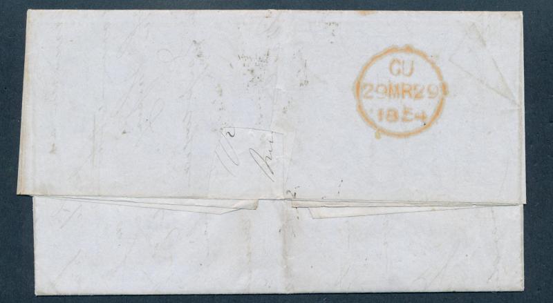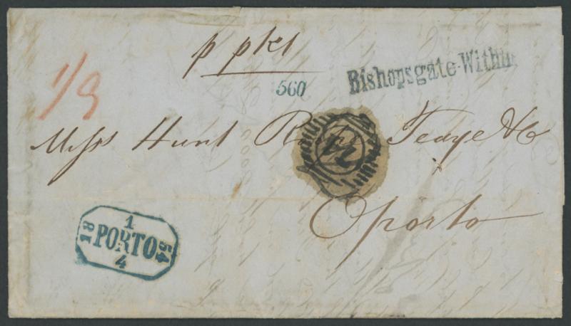 England (possibly as a consignee's letter) and posted with 'Bishopsgate Within' straight-line handstamp in blue rated "1/9"[d] in red at upper-left, 'PORTO/1/4/18/54' bevelled-boxed arrival datestamp in blue and Numeral-in-Bars '74' on the face,